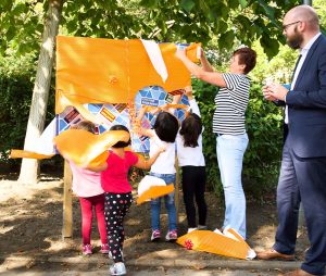 Die kleinen und großen Künstlerinnen und Künstler brachten die bunte Landkarte (1,30 m x 1,04 m) am Mittwoch, den 5. September, gemeinsam am Eingang an. FABIDO-Geschäftsführer Daniel Kunstleben beglückwünschte alle Aktiven zu dem begeisternden Ergebnis persönlich.