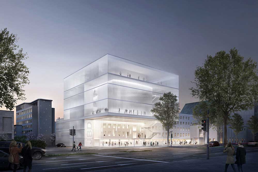 Der Siegerentwurf sieht einen quadratischen, gläsernen Kubus vor, der auf dem Sockel des auf Bestandshöhe ergänzten Schauspielhauses platziert wird. Die Besucher*innen werden vom Haupteingang am Hiltropwall über eine skulpturale Freitreppe an Kasse und Garderobe vorbei zur Studio- und weiter zur Hauptbühne geführt.
