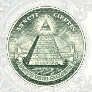 Dieses Bildelement der Ein-Dollar-Note zeigt eine unvollständige Pyramide, über der das Auge der Vorsehung und der lateinische Schriftzug Annuit coeptis prangt. Unterhalb befindet sich der Schriftzug Novus ordo seclorum – für viele Verschwörungstheoretiker ein wichtiges Indiz einer globalen Verschwörung des Illuminatenordens oder der Freimaurer. Foto: Wikipedia/ gemeinfrei