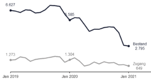 Die Nachfrage nach neuen Arbeitskräften ist im Januar weiterhin auf sehr niedrigem Niveau. So wurden der Agentur für Arbeit im aktuellen Berichtsmonat 649 neue Stellen gemeldet. Das sind 133 weniger als im Dezember, im Vergleich mit dem Vorjahr rund die Hälfte weniger. Der aktuelle Stellenbestand erreicht mit 2.795 offenen Stellen einen weiteren Tiefstwert. Er liegt um 2,5 Prozent niedriger als im Vormonat, im Vergleich zum Vorjahr um gut 50,0 Prozent niedriger.