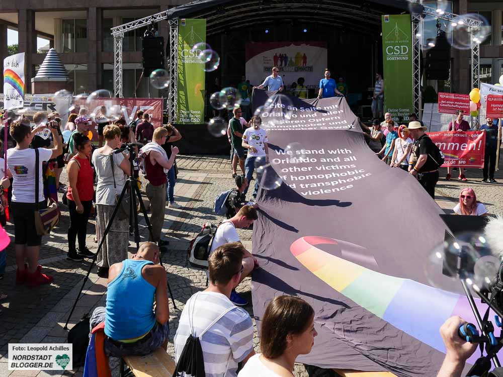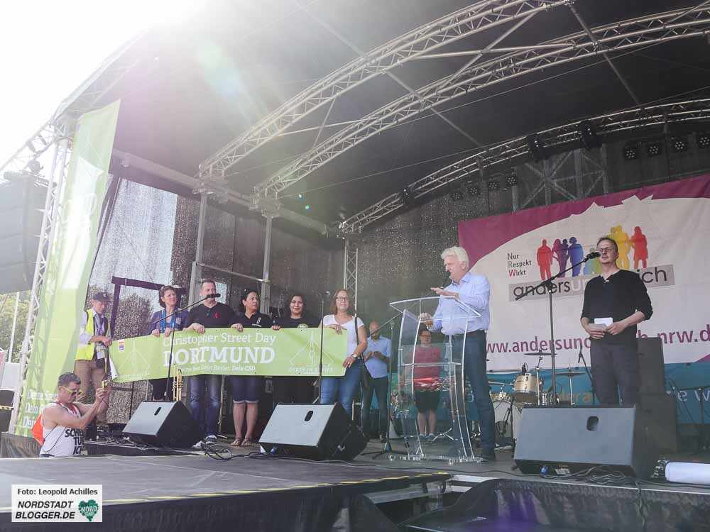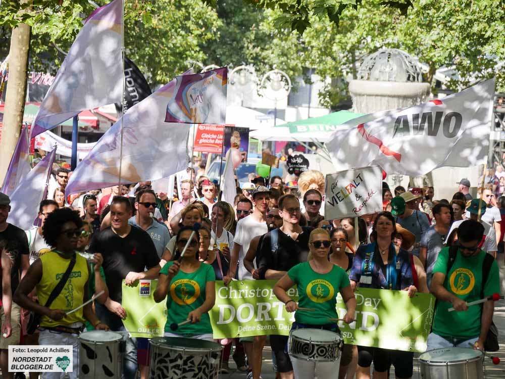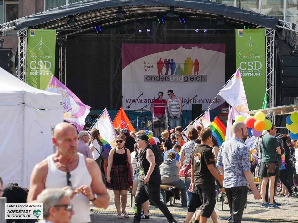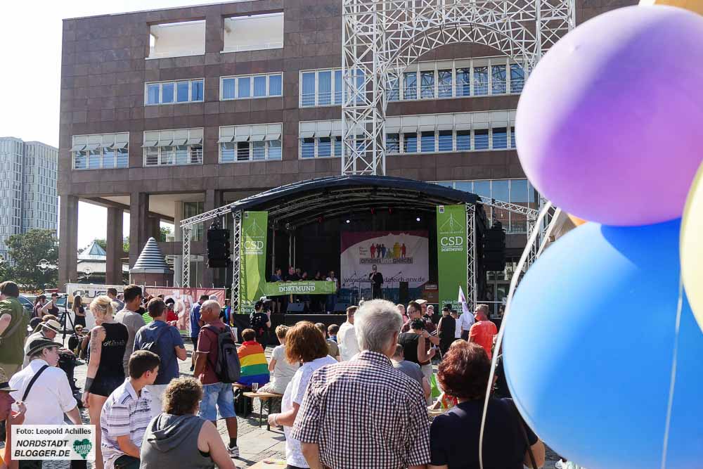 Bereits zum 20. Mal fand der ,Christopher Street Day‘ (CSD) bei sehr sommerlichem Wetter in der Dortmunder Innenstadt statt. Flankiert wurde das Fest auf dem Friedensplatz von einer Demonstration durch die City, bei der rund 1500 Menschen gemeinsam für eine offene und tolerante Gesellschaft sowie gegen Rassismus, Homophobie, Transphobie, Hass und Gewalt eintraten.