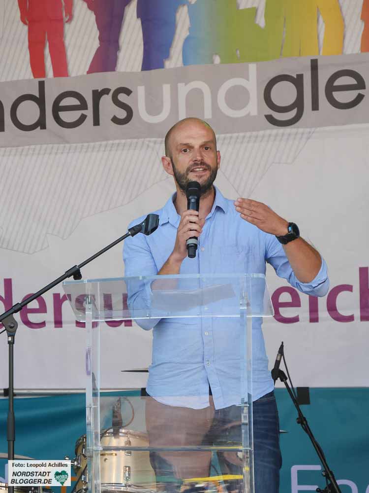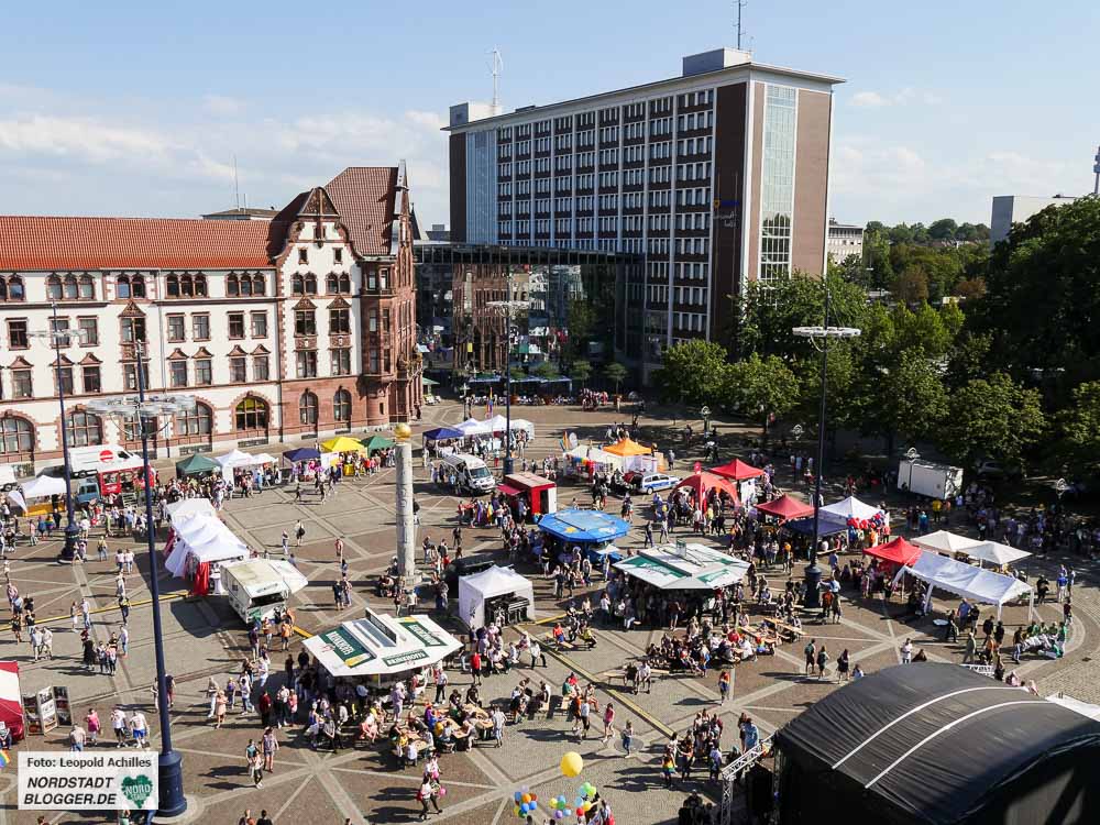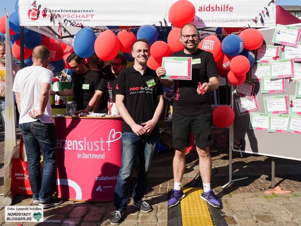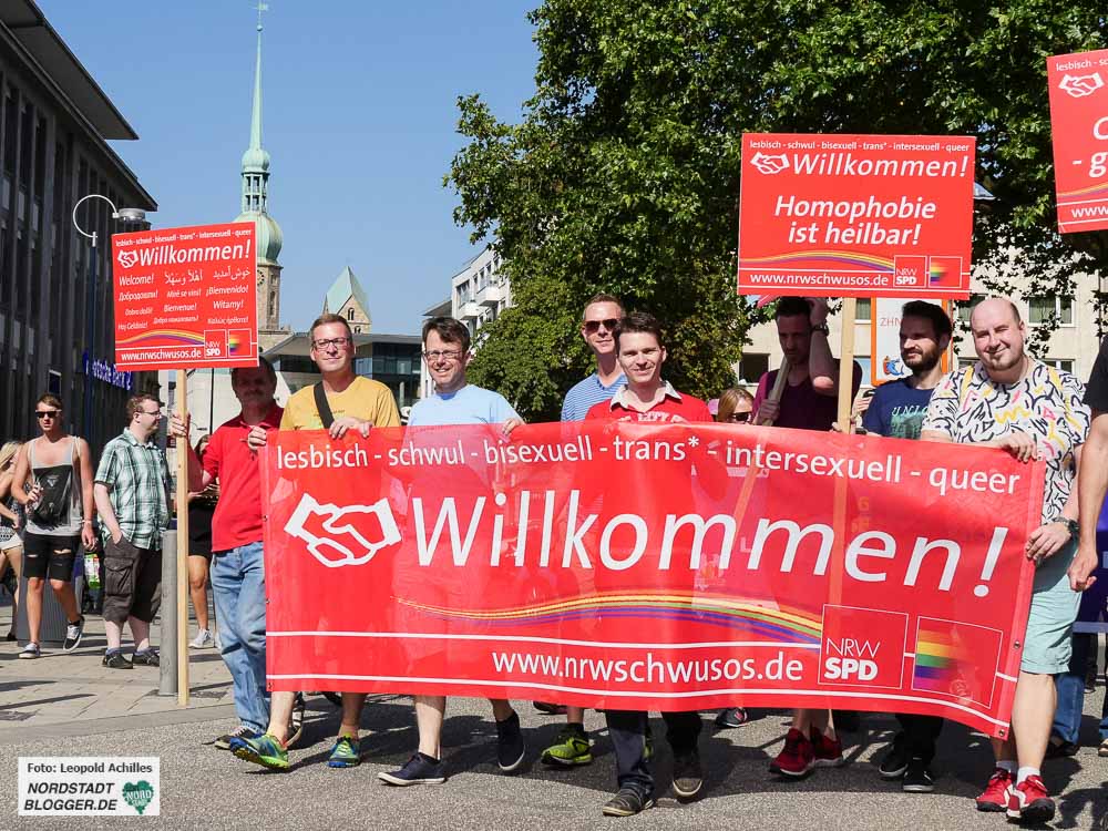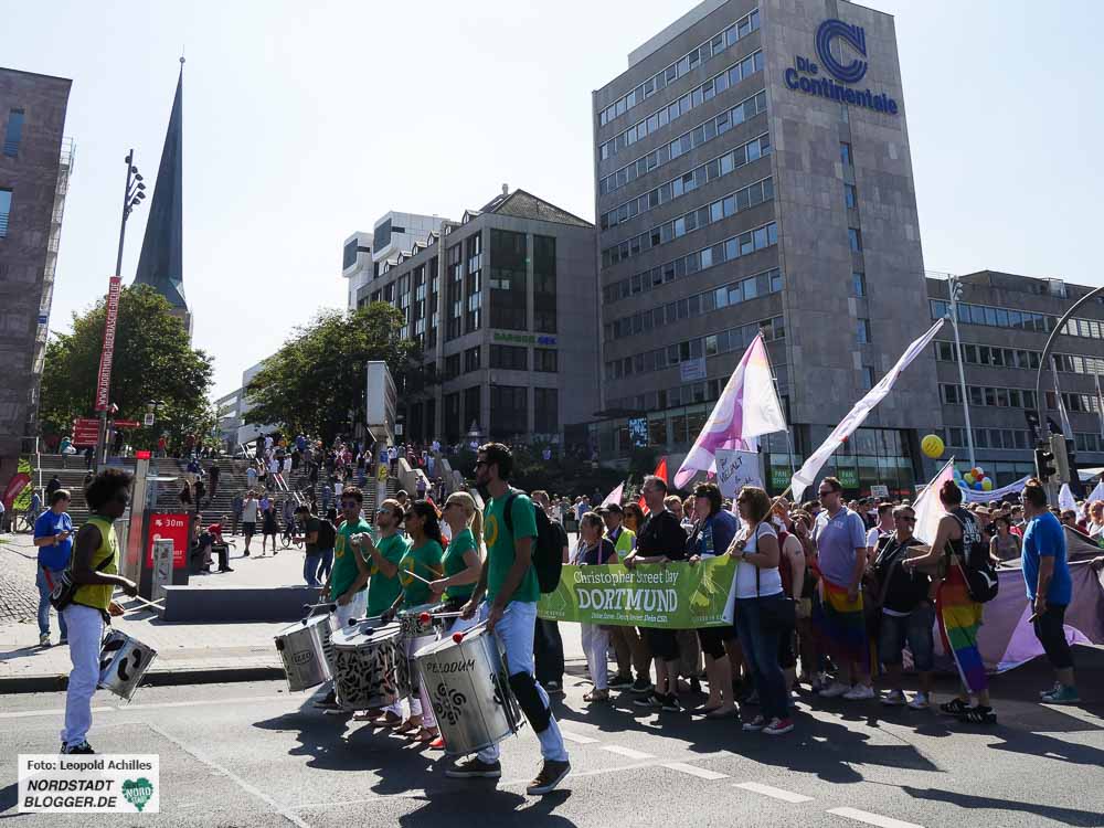 Bereits zum 20. Mal fand der ,Christopher Street Day‘ (CSD) bei sehr sommerlichem Wetter in der Dortmunder Innenstadt statt. Flankiert wurde das Fest auf dem Friedensplatz von einer Demonstration durch die City, bei der rund 1500 Menschen gemeinsam für eine offene und tolerante Gesellschaft sowie gegen Rassismus, Homophobie, Transphobie, Hass und Gewalt eintraten.