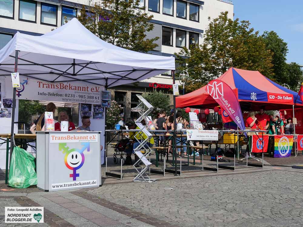 Auf dem Dortmunder Friedensplatz wurde es nach den Reden und dem Ende der Demonstration richtig voll: Stand für Stand gab es Informationen und Unterhaltung von Vereinen, Verbänden, Organisationen und Parteien.