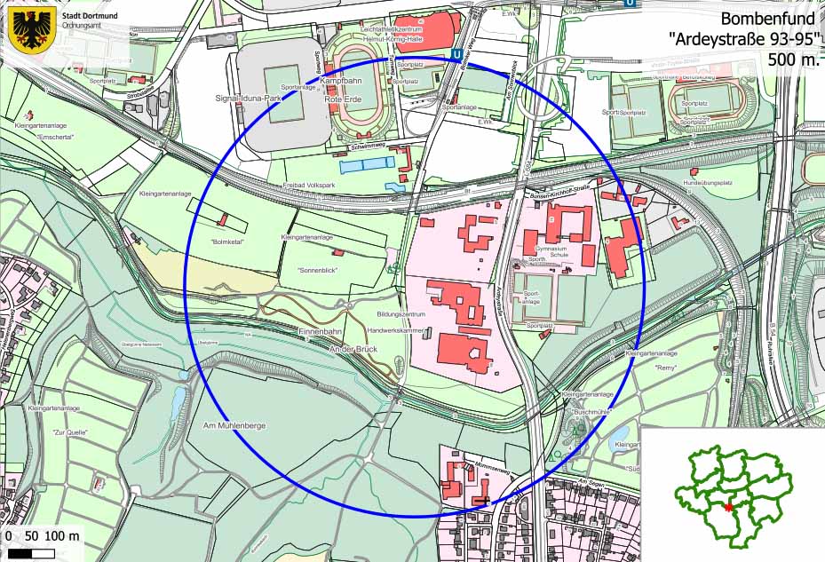 An der Ardeystraße in Dortmund ist ein britischer 250-Kilogramm-Blindgänger aus dem Zweiten Weltkrieg gefunden worden. Der Kampfmittelbeseitigungsdienst der Bezirksregierung Arnsberg wird ihn noch im Laufe des Dienstags (18. November 2025) entschärfen. Zur Sicherheit wird das umliegende Gebiet in einem Radius von 500 Metern ab circa 16 Uhr evakuiert.