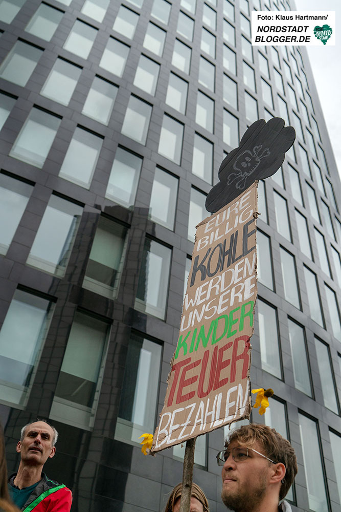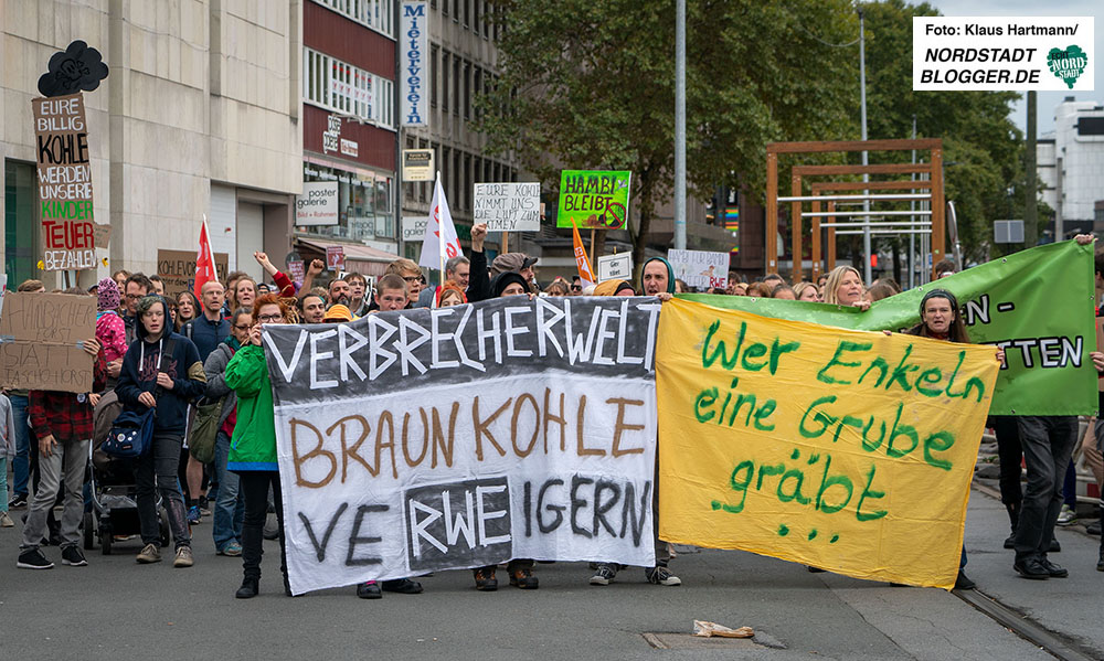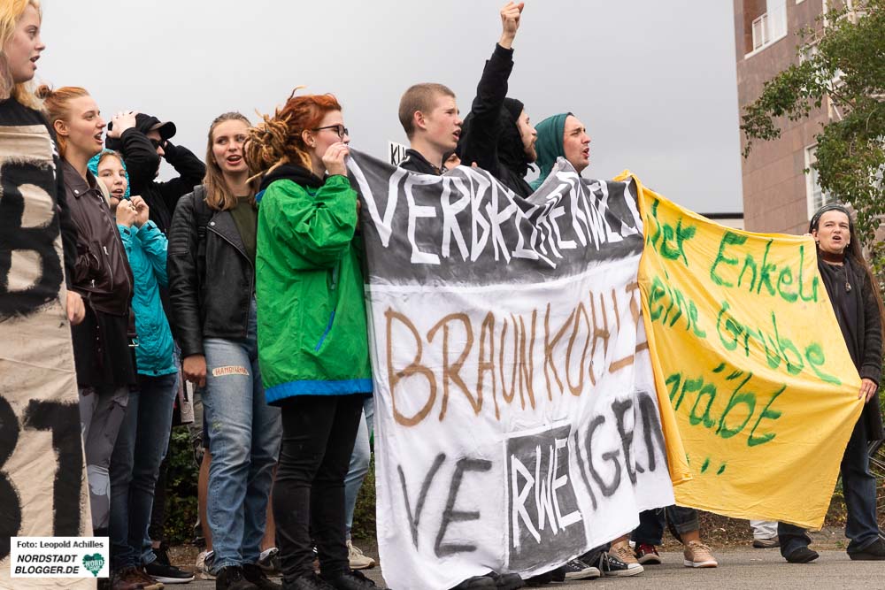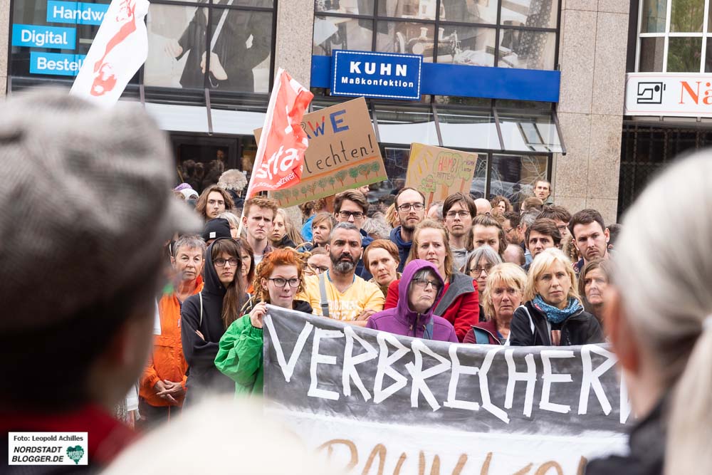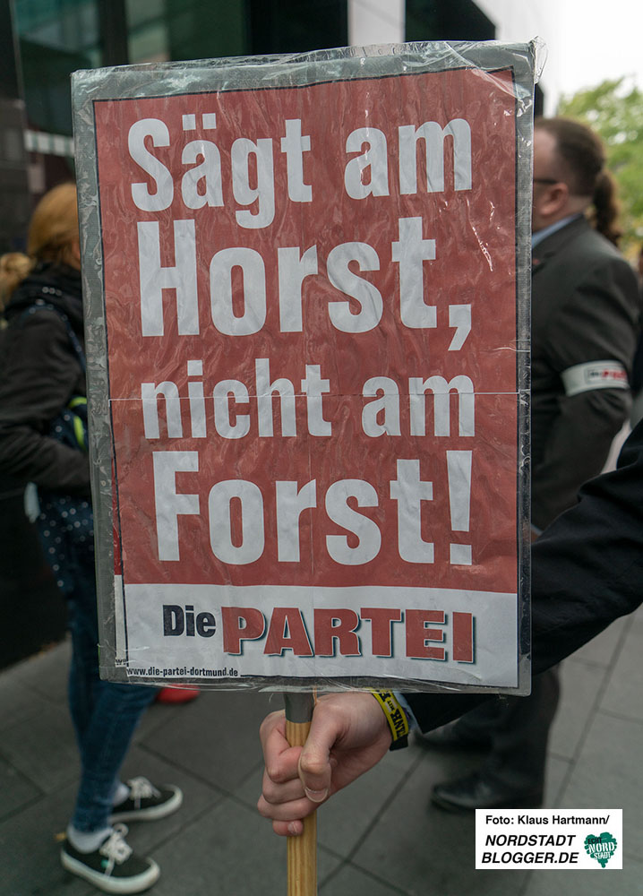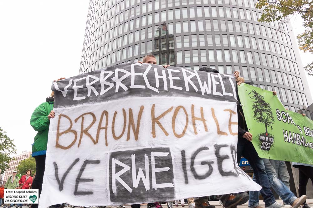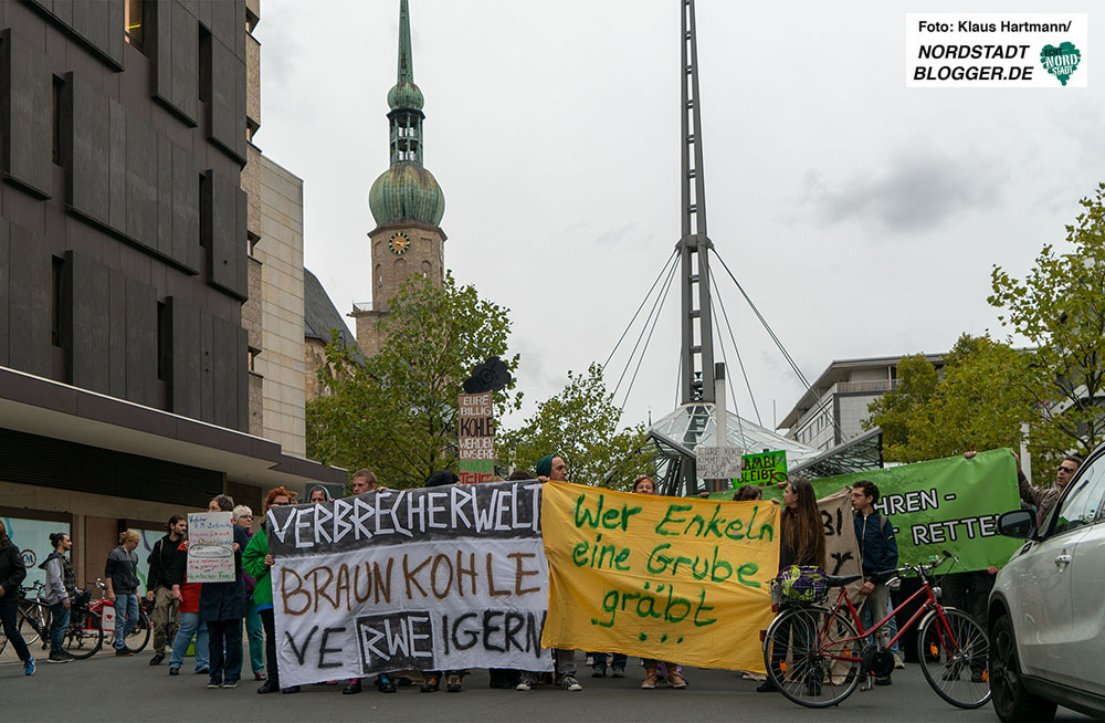 Gemeinsam zogen sie in einem Demonstrationszug durch die Innenstadt. Im Stadtgarten – unweit des Rathauses – fand die Abschlusskundgebung statt. Denn über die Dortmunder Stadtwerke DSW21 hält Dortmund 23,6 Millionen RWE-Aktien und ist damit der größte kommunale Einzelaktionär von RWE. „Die schmutzige Dortmunder Achse geht also vom RWE-Tower zum Rathaus sowie zu DSW21 und DEW21 und somit direkt in den Hambacher Forst“, betonen die DemonstrantInnen.