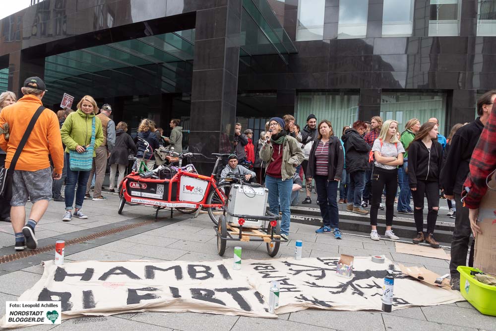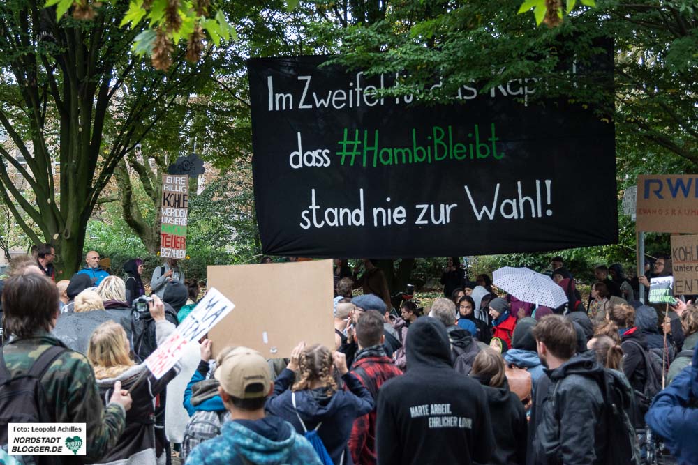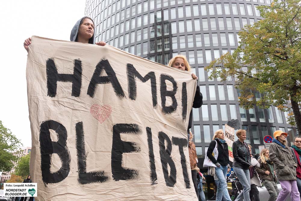 Deshalb wurde zum Abschluss auch ein großes Transparent gespannt:„Im Zweifel für das Kapital, dass #Hambibleibt stand nie zur Wahl“. Um auf die Räumung der Protestbaumhäuser aufmerksam zu machen, kletterten an diesem Samstag auch Menschen in Dortmund in Bäume.