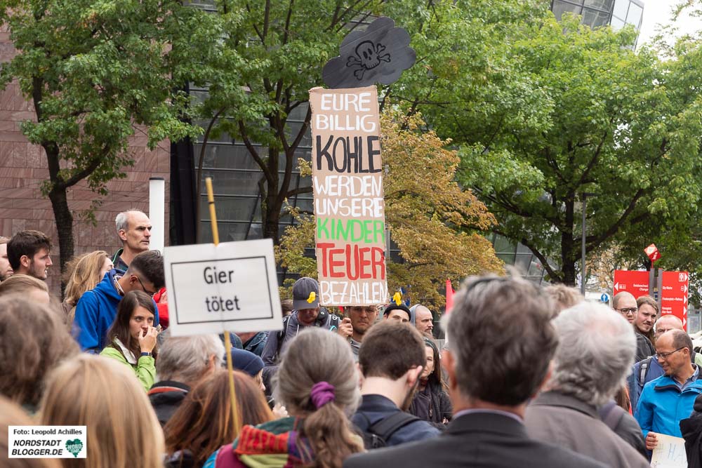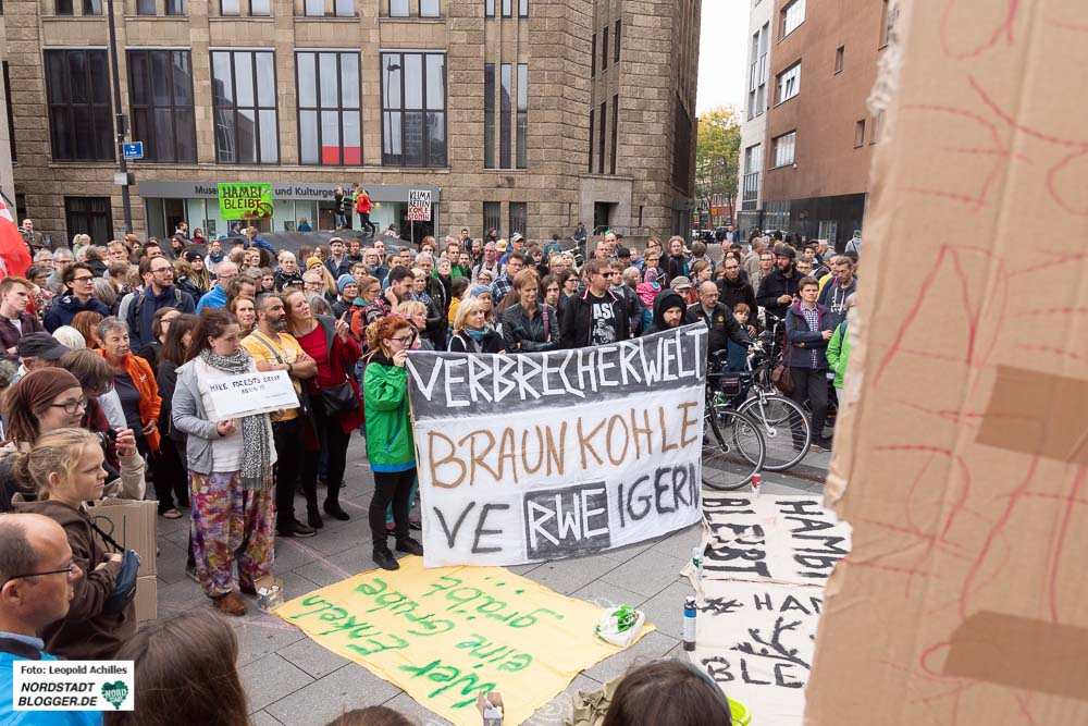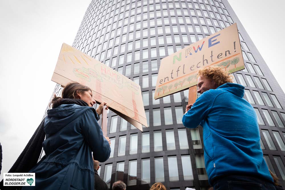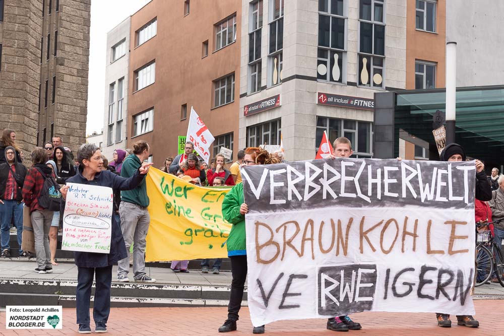 Rund 250 Menschen haben am Samstag (22. September 2018) in Dortmund gegen den Braunkohleabbau von RWE und die Rodung des Hambacher Forstes demonstriert. Vor dem RWE-Tower fanden sich die Menschen ein, sammelten Unterschriften für den Stopp des Tagebauprojektes und machten mit Redebeiträgen auf die aus ihrer Sicht verfehlte Energiepolitik aufmerksam.