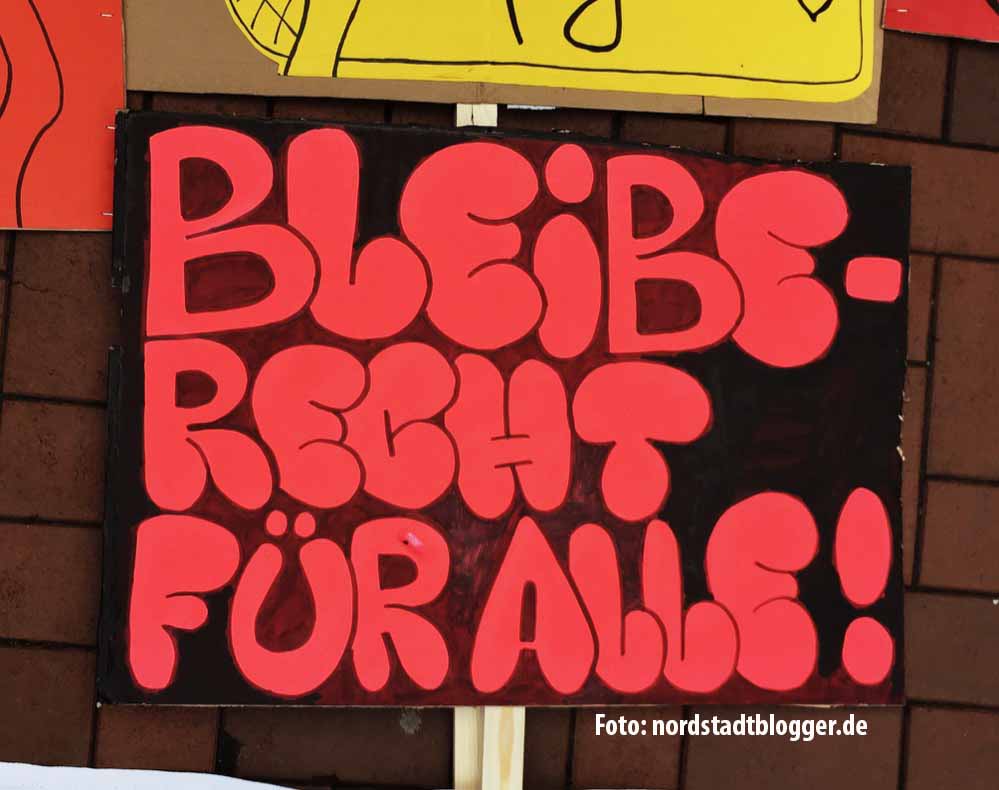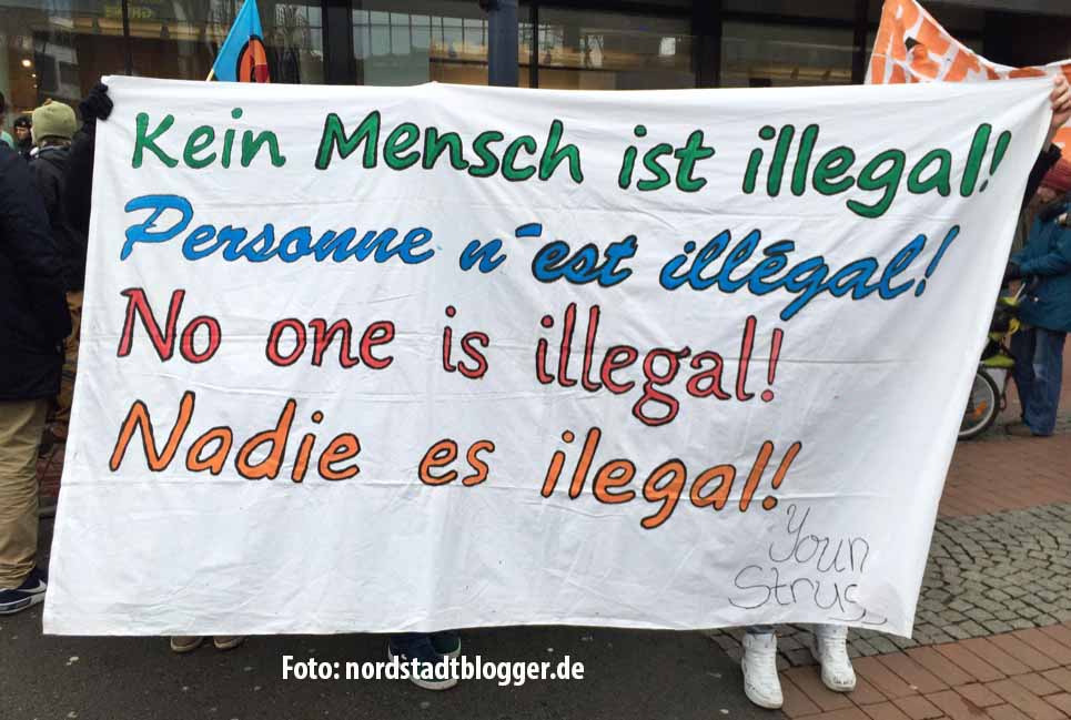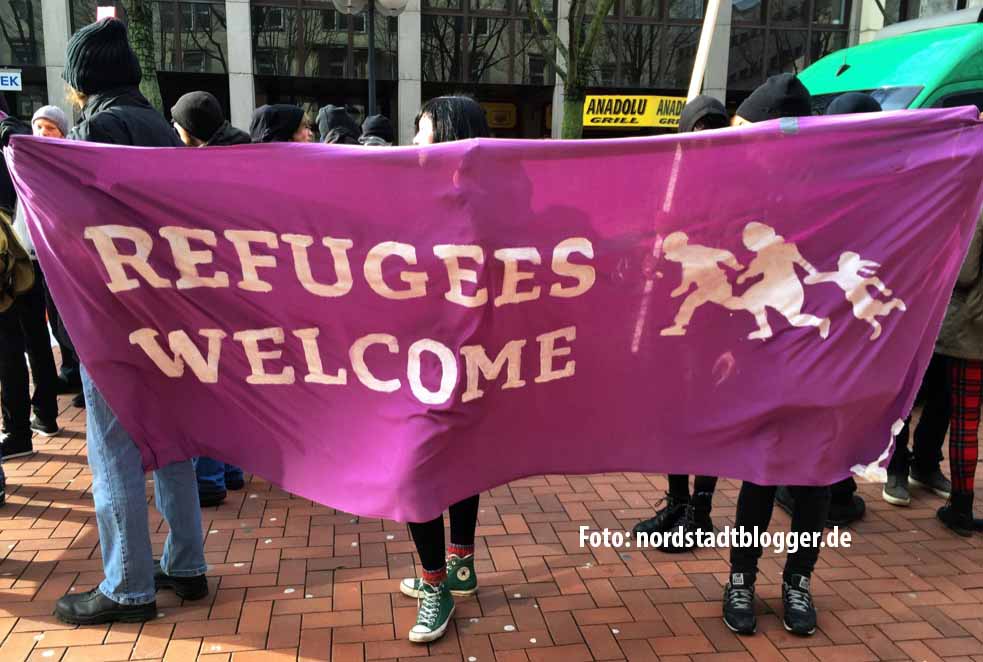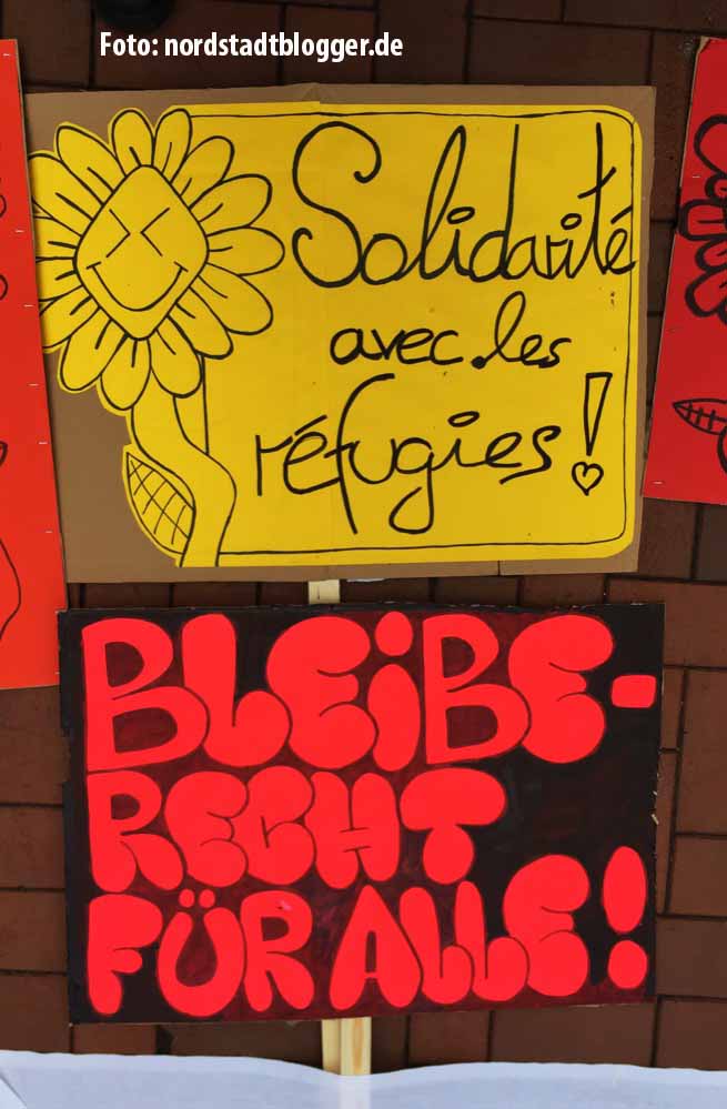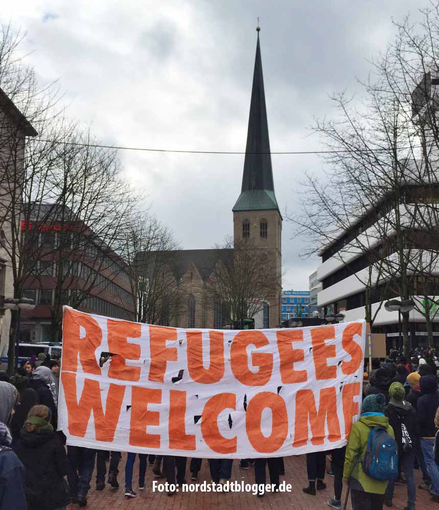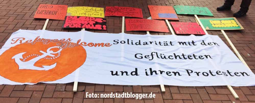 Mit ihrer ersten Demo in der Innenstadt wollten sie noch mehr Menschen ansprechen, sich mit den Flüchtlingen zu solidarisieren. Mit mehreren Zwischenkundgebungen ging es von den Katharinentreppen durch die Innenstadt und über den Wall bis zum Alten Markt.