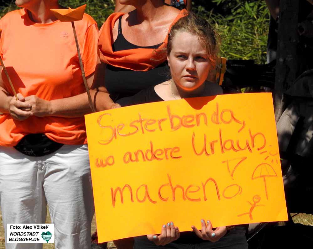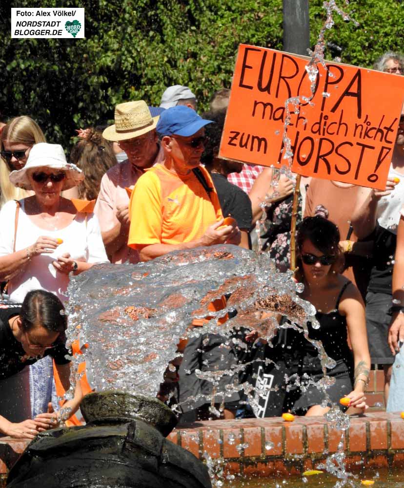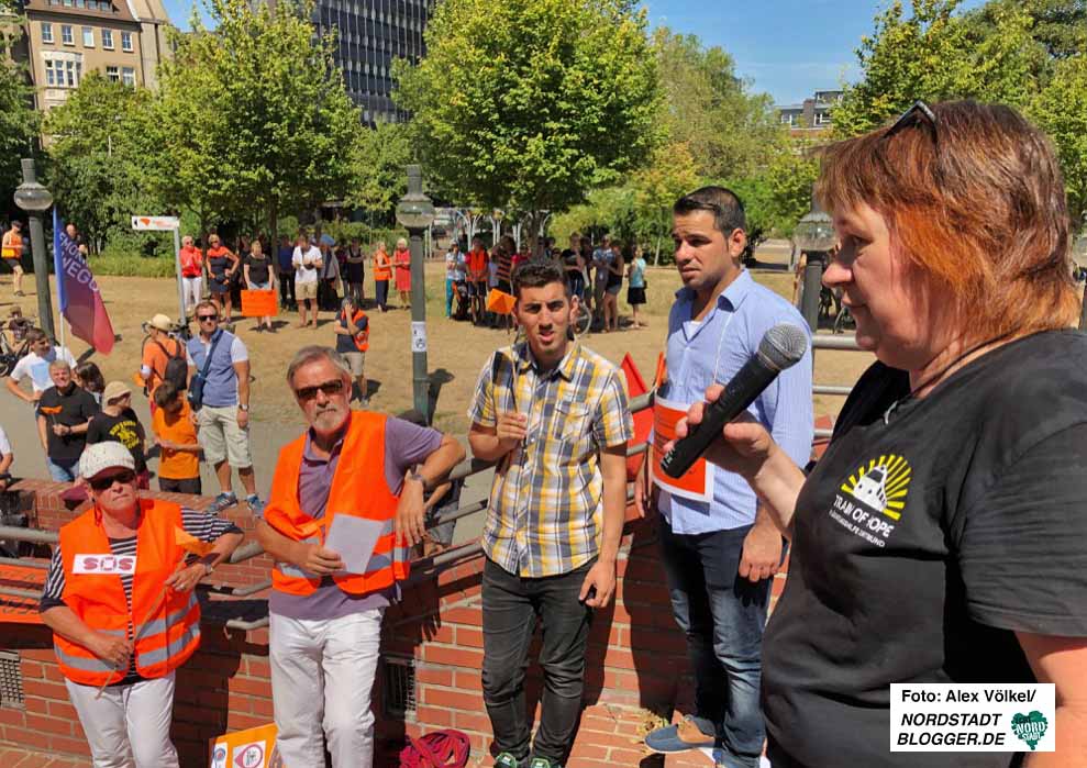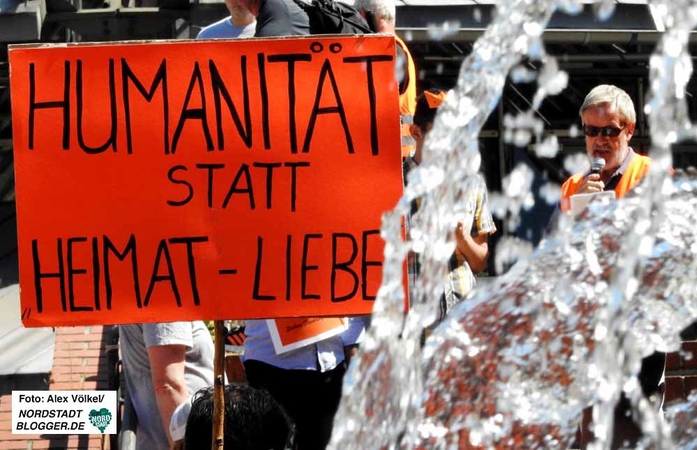 Bewegend war der Wortbeitrag von Ahmad aus Syrien. Flüchtlingspate Heinz Herwig lieh ihm seine Stimme und trug den Leidensweg von Ahmad vor den rund 700 Menschen im Stadtgarten vor. Auch hier der Beitrag im Wortlaut.