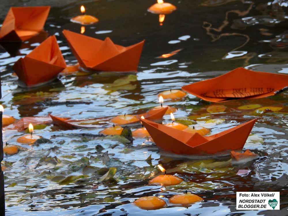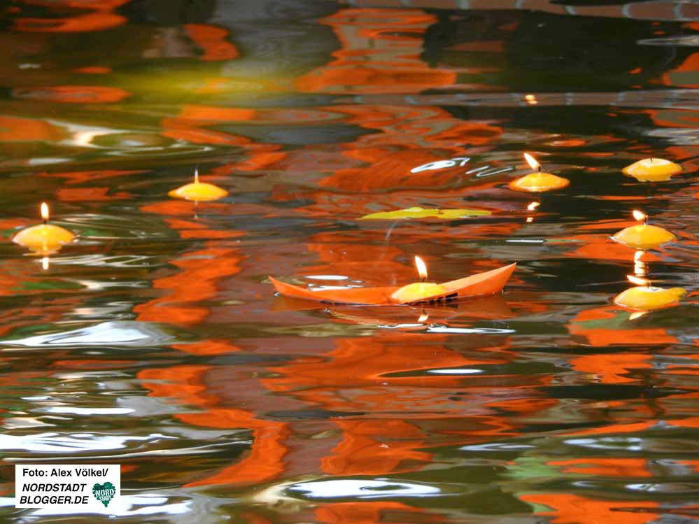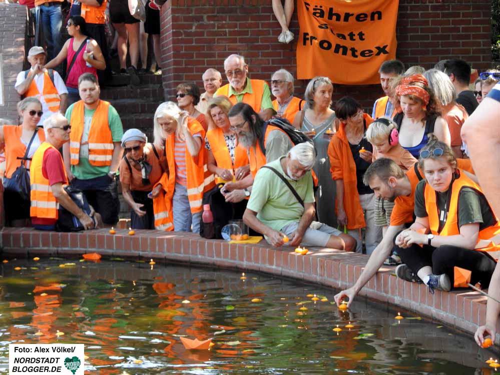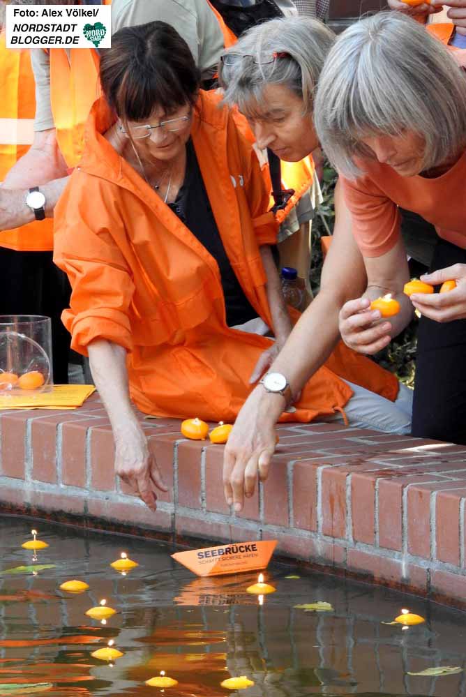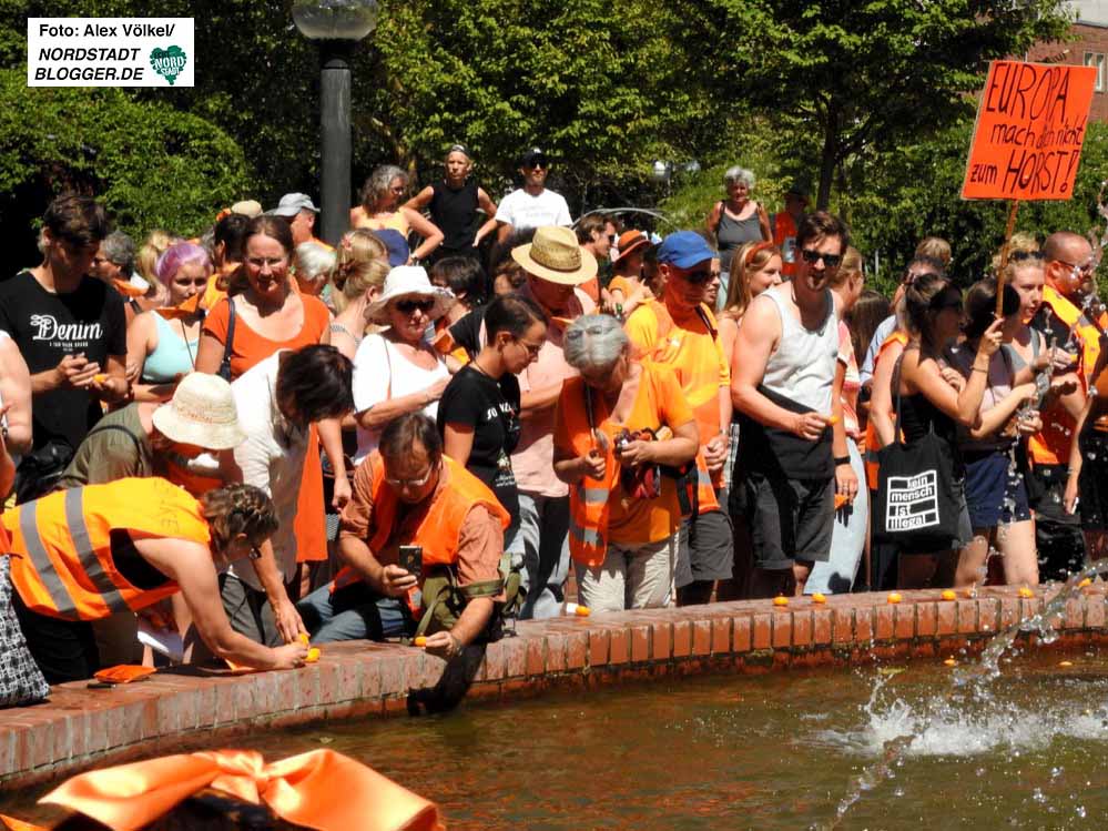 Zum Abschluss zündeten die TeilnehmerInnen 629 orangene Schwimmkerzen an und setzen sie in das Wasser des Gaukler-Brunnens. Dies verstanden sie als Zeichen und zum Andenken an 629 Menschen, die allein im Monat Juni 2018 im Mittelmeer ertrunkenen sind.
