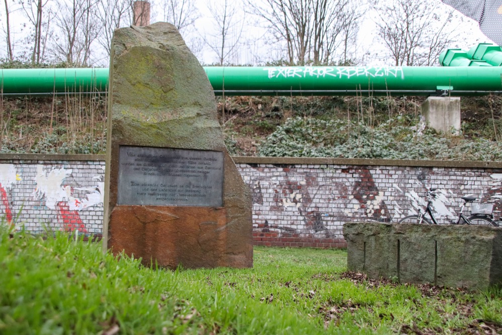 Inschrift des Gedenksteins: „Den Toten zum Gedenken, den Lebenden zur Mahnung“