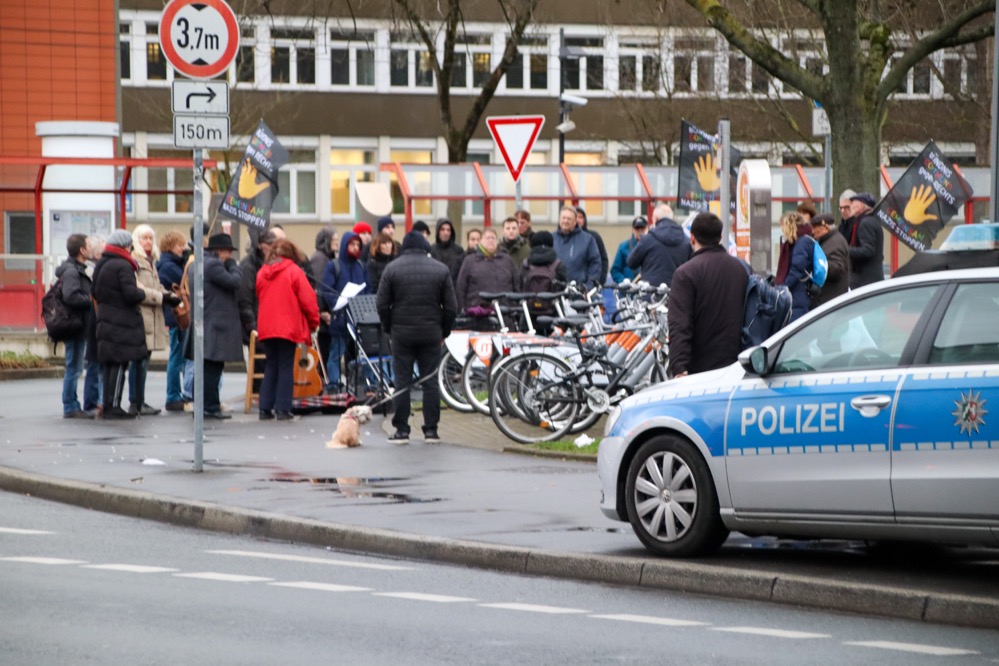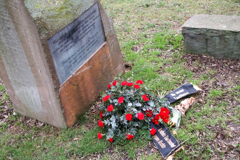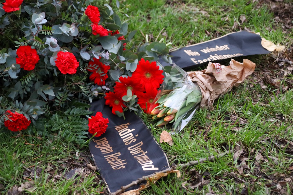 Hier lud unter anderem das Bündnis Dortmund gegen Rechts (BDgR) zu einer Gedenkkundgebung am ehemaligen Ostbahnhof ein. Von hier aus wurden 1943 150 Sinti und Roma nach Auschwitz deportiert. Für sie kam die Befreiung zu spät – heute erinnert ein Gedenkstein an der Weißenburger Straße Ecke Gronaustraße an sie.