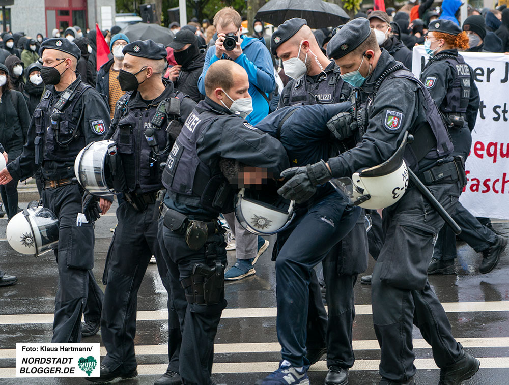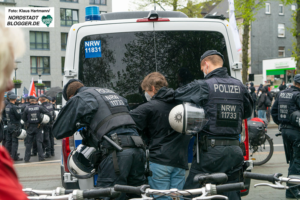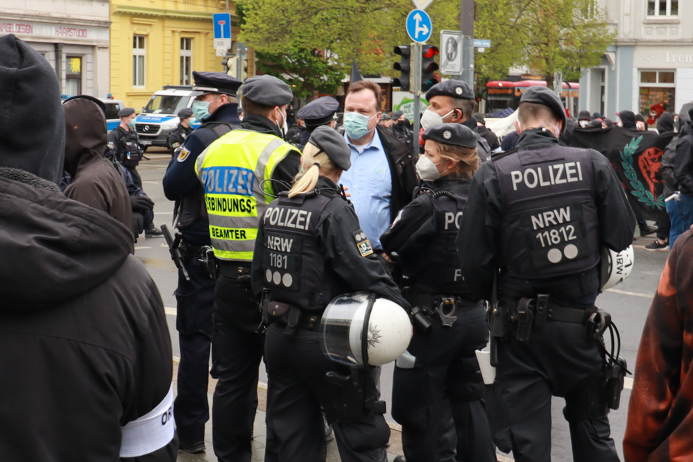 Die Beamt*innen drängten die Demonstrierenden aus Bochum zurück, um die Einhaltung der Infektionsschutzauflagen der Stadt gewährleisten zu können. Während dieser Maßnahme warf eine teilnehmende Person eine Plastikflasche auf die Einsatzkräfte.