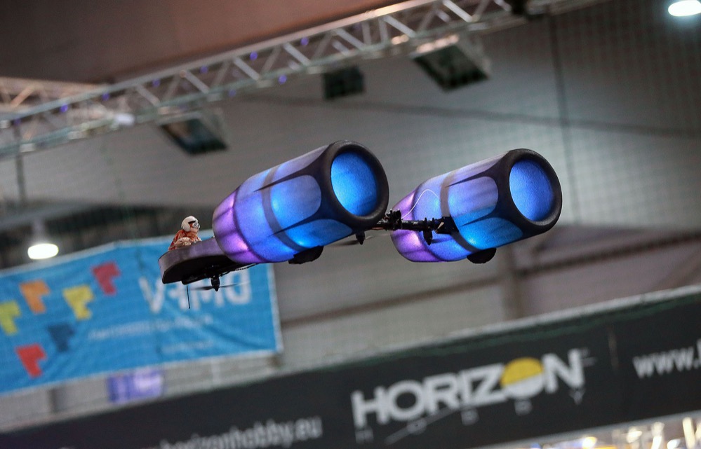 Zwei neue Programmpunkte starteten besonders am Messe-Wochenende richtig durch. Zum einen flogen in diesem Jahr erstmals ferngesteuerte Multikopter in der Westfalenhalle heiße Rennen aus. Gesteuert wurden sie mit einer Computerbrille aus Pilotensicht – eine Perspektive, die sich per Bildschirm auch den Besuchern eröffnete [First Person View (FPV) = Steuerung aus Pilotensicht].