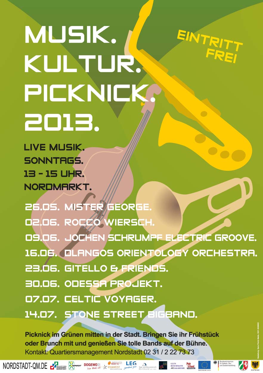 Im Rahmen der Reihe Musik.Kultur.Picknick. findet vom 26. Mai bis 14. Juli jeden Sonntag auf dem Nordmarkt zwischen 13 und 15 Uhr ein Konzert statt.Für die Bandsuche und Organisation kooperierte das Quartiersmanagement Nordstadt mit der Pop School und der Glen-Buschmann-Jazz-Akademie. „Dank dieser Zusammenarbeit ist es gelungen die Auftritte der Reihe noch hochwertiger zu besetzen“, sagt Quartiersmanager David Grade.