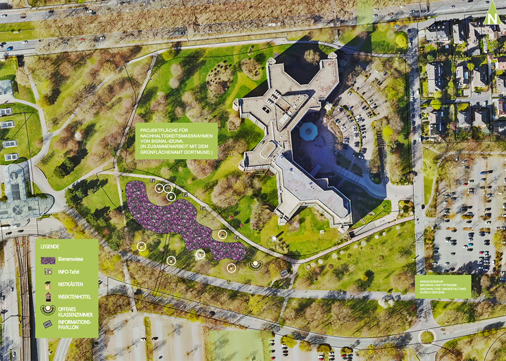 Bei der Signal Iduna sind die Pläne zur Umgestaltung der Flächen rund um die Hauptverwaltung besonders konkret: Das Betriebsgelände der Signal Iduna-Gruppe zeichnet sich mit seinem alten Baumbestand schon jetzt dadurch aus, dass zahlreichen Tierarten wichtige Nahrungsquellen und Fortpflanzungsmöglichkeiten geboten werden.