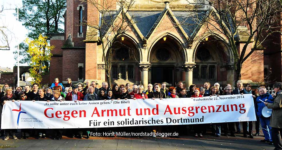 Zeichen gegen die Armut: ein acht Meter langes Banner entrollten die Teilnehmer der Schwerpunktveranstaltung zur Themenwoche "Armut in Dortmund" der evangelischen Kirche in Dortmund-Lünen-Selm am Samstag, 22.November 2014 vor der Pauluskirche an der Schützenstraße.