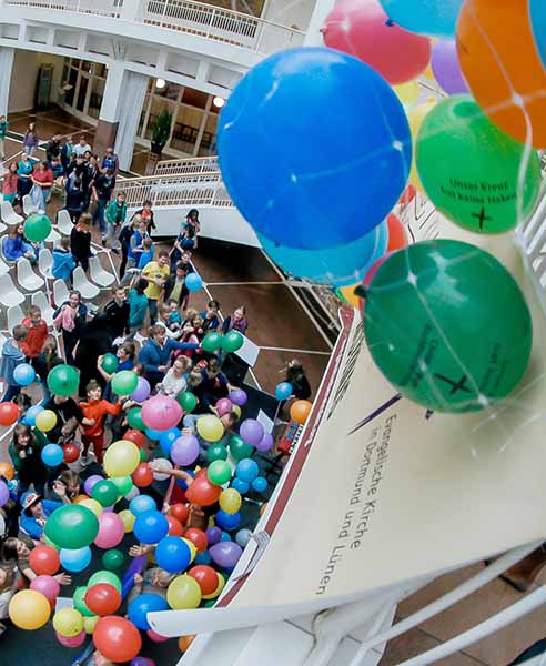 Eine Luftballonaktion mit mehreren hundert bunten  Luftballons war Abschluss der Aktion. Veranstalter des Konfirmandenprojekts waren der Arbeitskreis Christen gegen Rechtsextremismus und der Evangelische Kirchenkreis Dortmund.