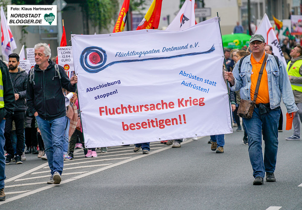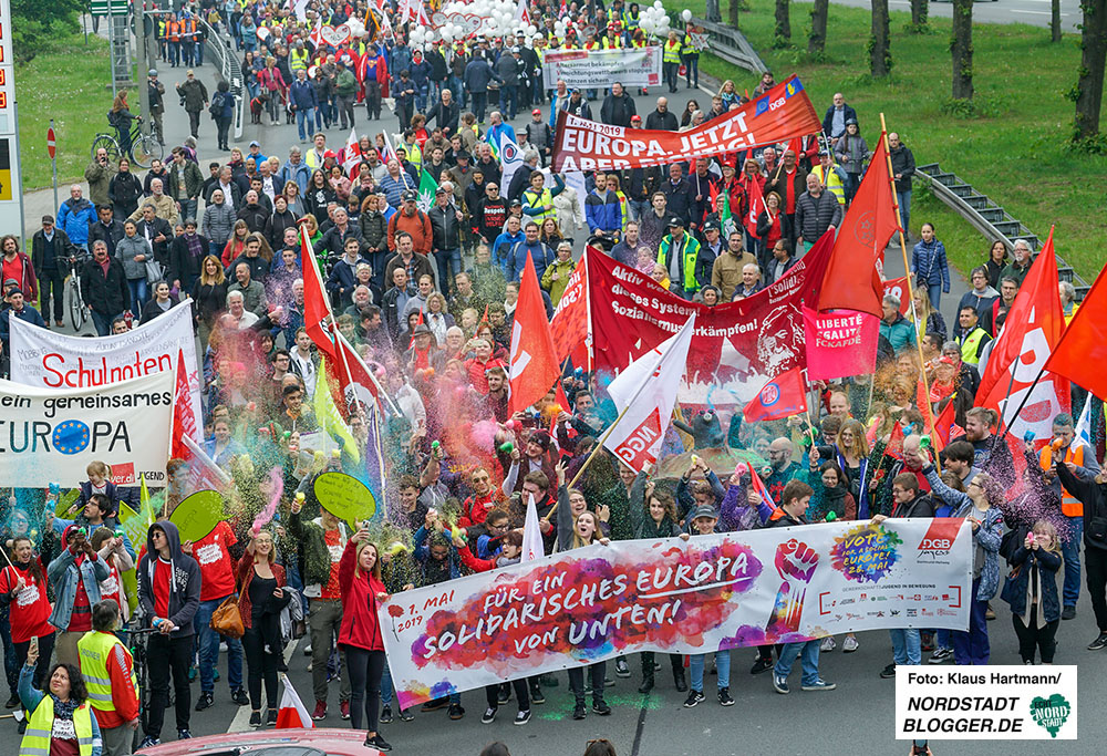 Für eine soziale Gesellschaft zeigten am heutigen Mittwoch rund 3000 Menschen Flagge. Der Demo-Zug zum 1. Mai war dementsprechend lang. Nach gut einer Stunde Fußweg vom Opernhaus aus war der Westfalenpark erreicht, wo um 12 Uhr die Kundgebung begann. Dieses Jahr hatte der DGB Ralf Kutzner, geschäftsführendes Vorstandsmitglied der IG Metall als Redner eingeladen. Der appelierte an die große Zuhörer*innenschaft vor der Bühne, am 26. Mai bei der Wahl zum Europaparlament unbedingt die Stimme abzugeben.