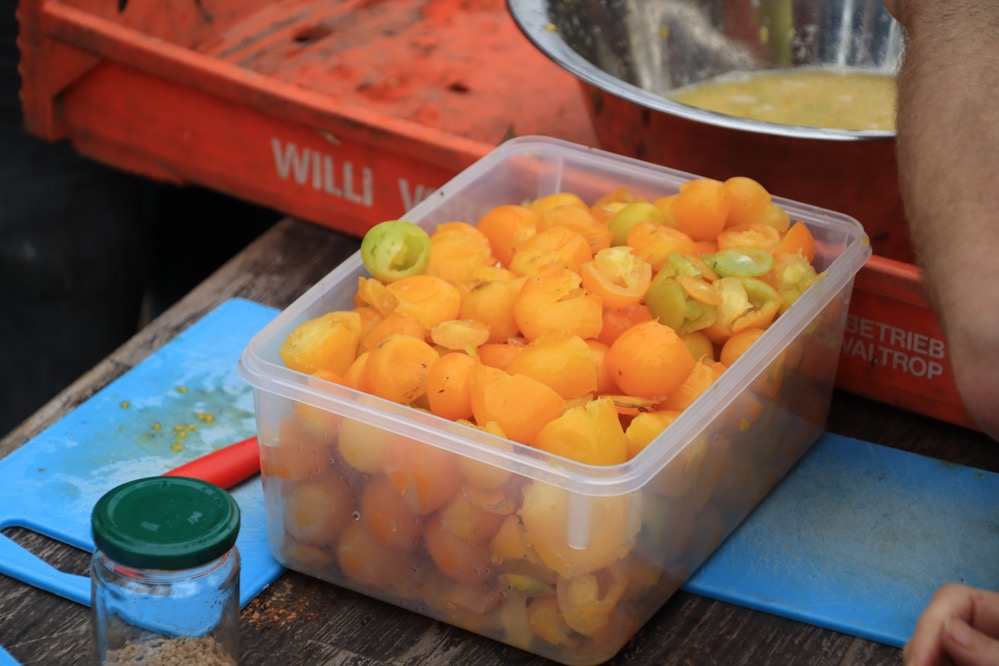 Die reifen Tomaten wurden nun abgeerntet und die Samen aus ihnen ausgedrückt. Anschließend werden die Kerne für drei Tage in ein Wasserbad gelegt. „Durch die Gährung löst sich. Der Keimschutz von den Samen.“ erklärt Jörg Lüling, Mitglied des Vereinsvorstandes der Solidarischen Landwirtschaft in Dortmund.