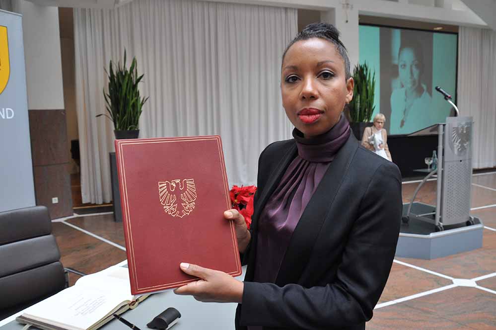 Alle zwei Jahre wird diese Auszeichnung vergeben. Zahlreiche Gäste nahmen in der Bürgerhalle an der Feierstunde teil. Marie N’Diaye trug sich nach der Preisübergabe ins Goldene Buch der Stadt ein.
