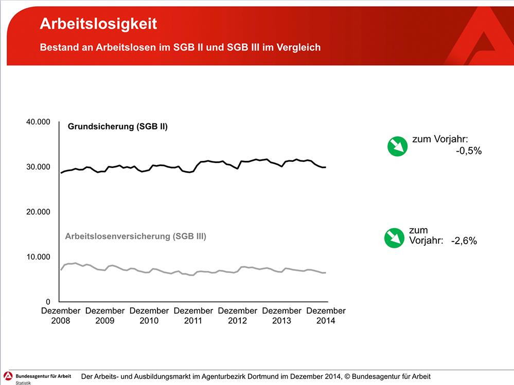 Das Jobcenter Dortmund, das für die Betreuung der Arbeitslosen im Rechtskreis des Zweiten Sozialgesetzbuches (SGB II) zuständig ist, meldet ebenfalls einen marginalen Anstieg der Arbeitslosigkeit. Waren im November noch 29.902 Personen arbeitslos gemeldet, so sind es im Dezember 29.925 – 23 Personen oder 0,1 Prozent mehr. Im Vorjahresvergleich zu Dezember 2013 ist die Arbeitslosigkeit in der Grundsicherung um 145 Personen oder 0,5 Prozent gesunken.