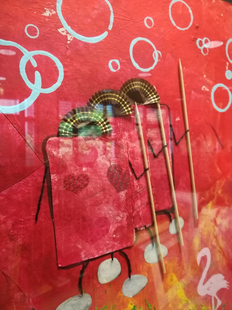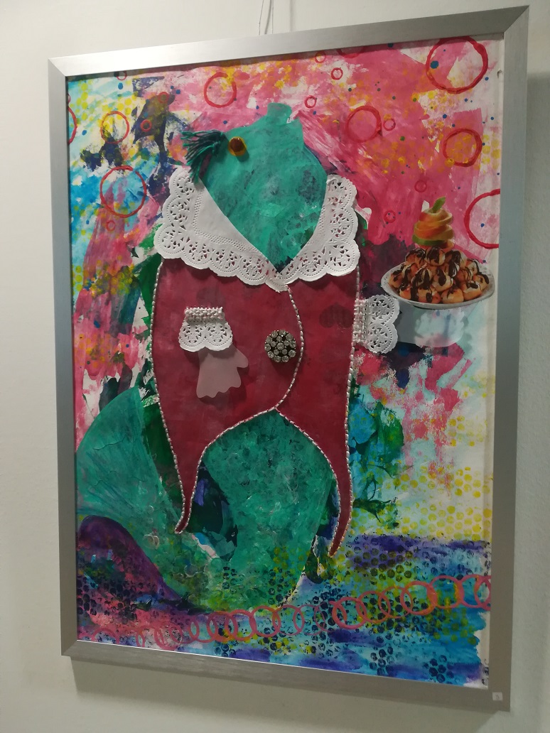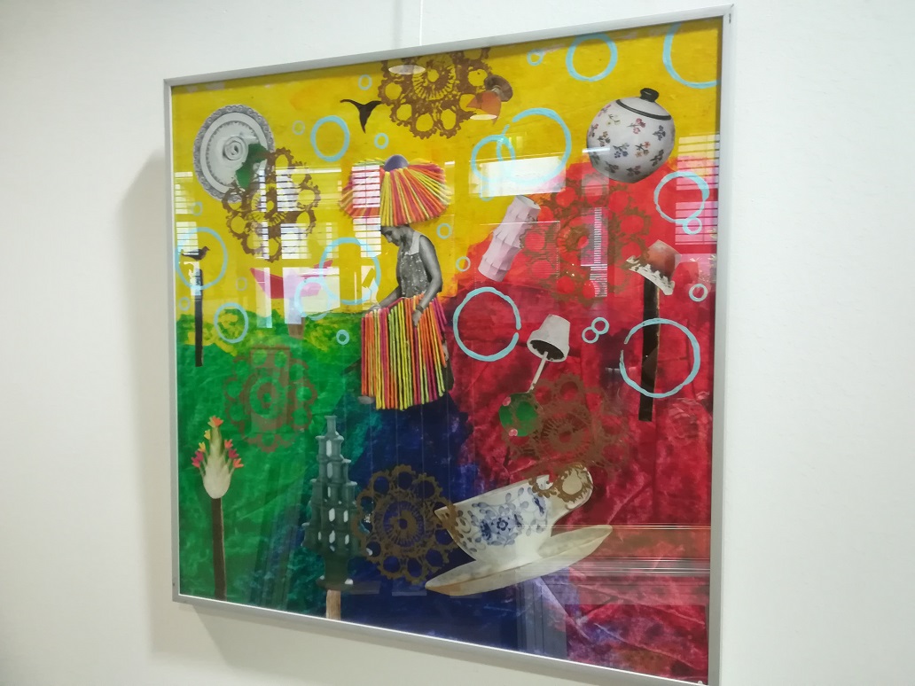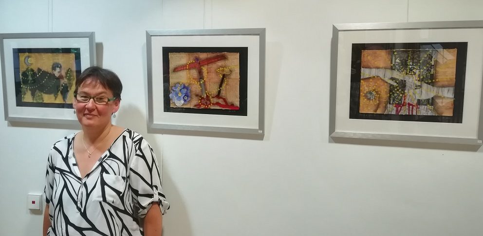 Bilder in Acrylmalerei, Objekt- und Stempeldruck, Collagen und Nähmalerei zu sehen