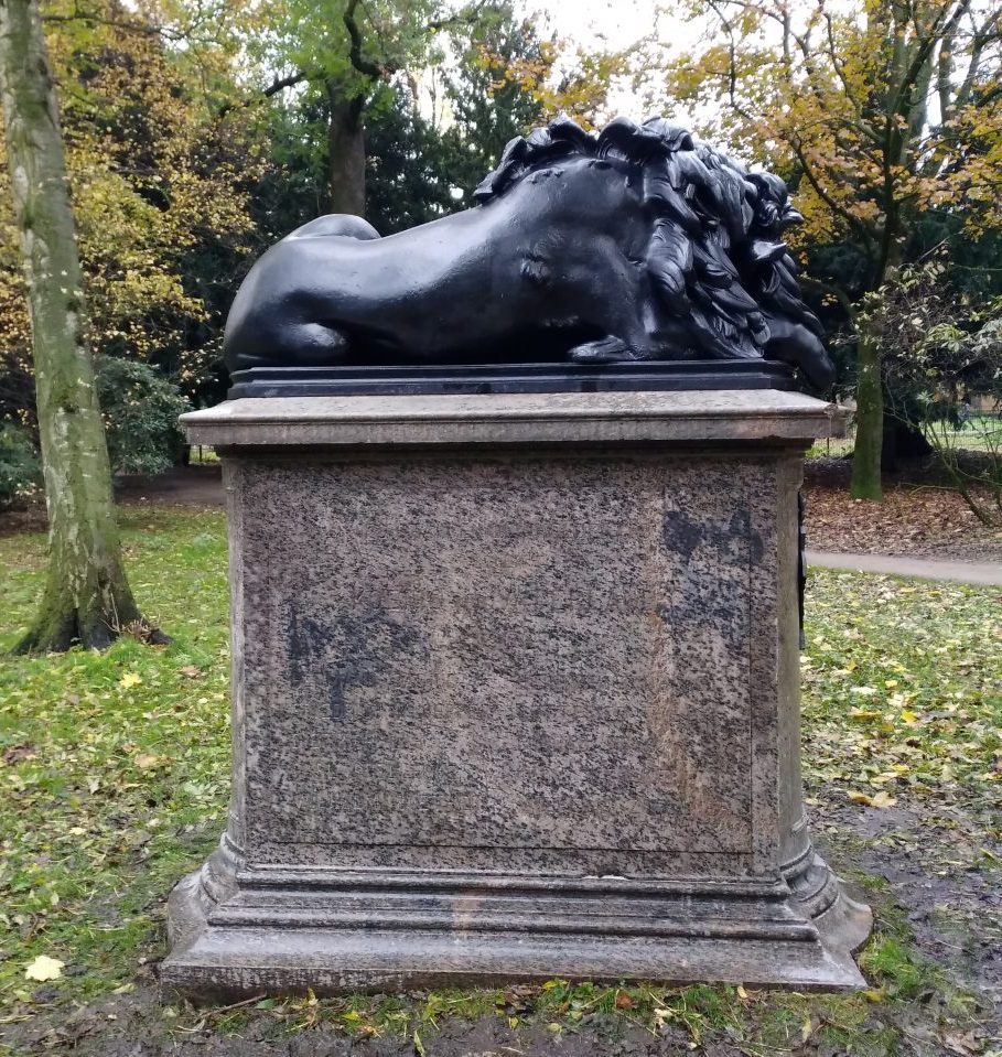 Das bekannte Löwendenkmal im Westpark ist Dortmunds ältestes Kunstwerk im öffentlichen Raum: Die Bronzeskulptur aus dem Jahr 1869 von Melchior Anton zur Strassen stand zunächst am Königswall, später am Westentor und seit 1952 im Westpark. Sie erinnert an zehn gefallene Soldaten aus Dortmund, die bei der Schlacht bei Königgrätz am 3. Juli 1866 ums Leben kamen. Jetzt wurde das Denkmal, das seit der letzten großen Restaurierung 2012 wieder allerhand ungewollte Farbe abbekommen hat, gereinigt und bearbeitet.