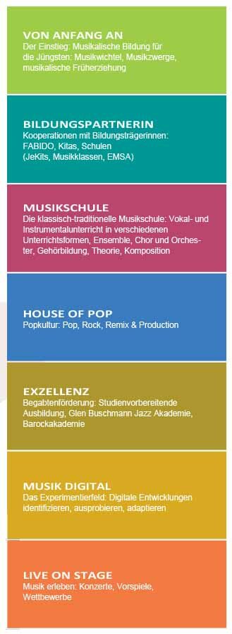 Weitere Bereiche der neuen Struktur sind das „House of Pop“, „Musik Digital“ und die „Exzellenz“ mit der Begabtenförderung in der Studienvorbereitenden Ausbildung sowie der Barockakademie und der Glen Buschmann Jazz Akademie – beide bundesweit einzigartig. Der Veranstaltungsbereich wird sich als Sparte „Live on stage“ weiter profilieren.