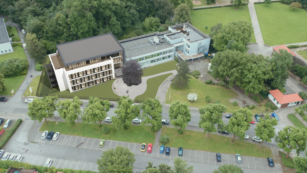 Richtfest am Hoeschpark: der Canisius Campus Dortmund erhält an der Kirchderner Straße ein neues, 6.000 Quadratmeter umfassendes Schulgebäude, das direkt an das alte Bestandsgebäude angeschlossen ist. Etwa 750 Schüler*innen wird dergestalt die Möglichkeit geboten, eine moderne Pflegeausbildung zu absolvieren. Das trifft den Nerv der Zeit – Stichwort: Pflegenotstand.