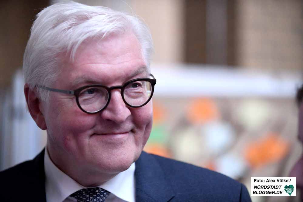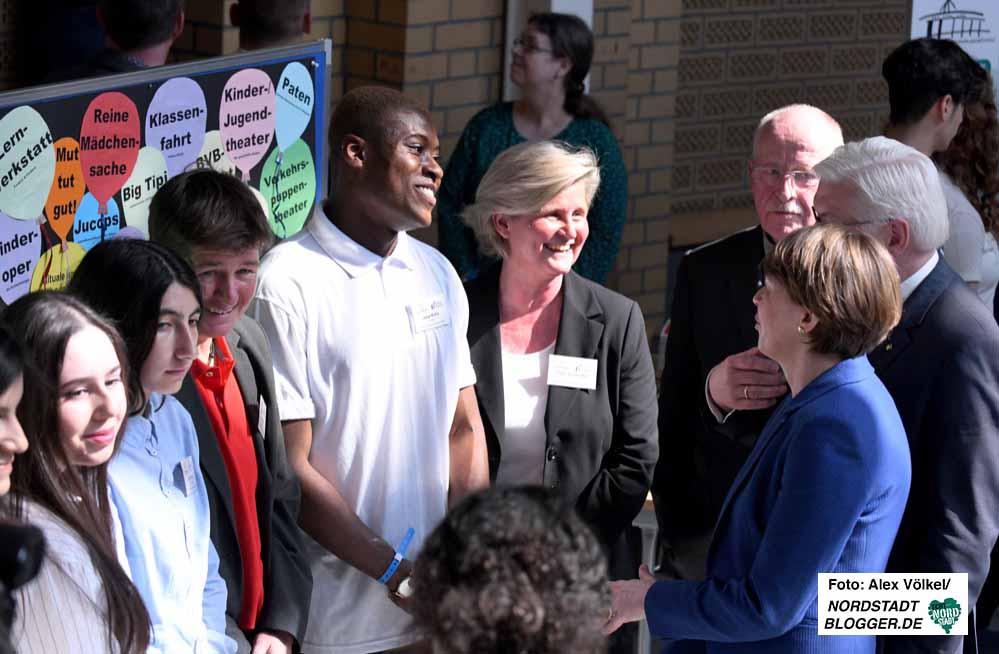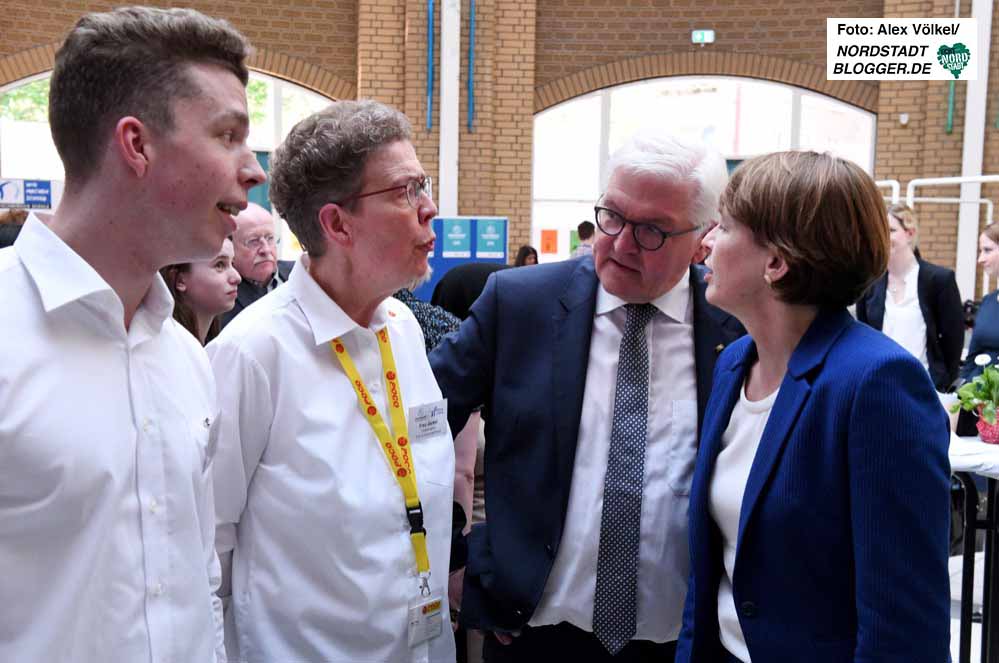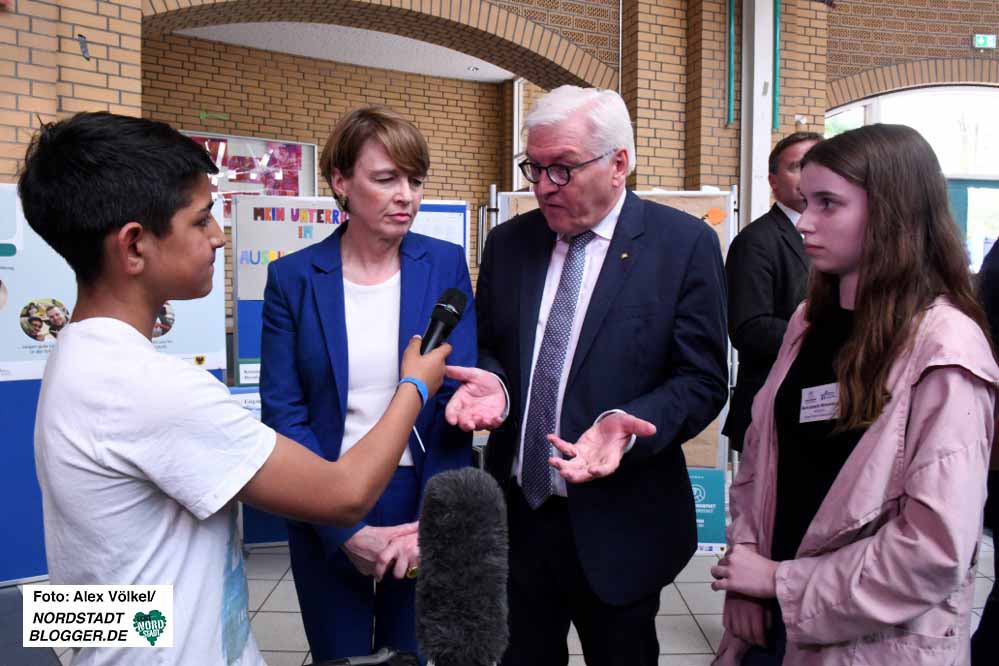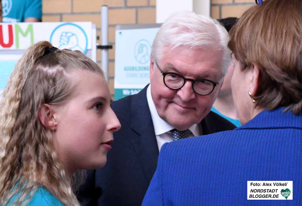 Steinmeier zeigt sich beeindruckt von dem was er sieht und hört. Lässt sich beim Rundgang durch die Aula der Schule Zeit – und auch nicht lumpen. Als beispielsweise ein Schülervertreter auf seine Frage, ob denn da noch Wünsche seien, geradeheraus eine Reise nach Berlin anspricht, steht postwendend eine Einladung für die gesamte SV in die Bundeshauptstadt.