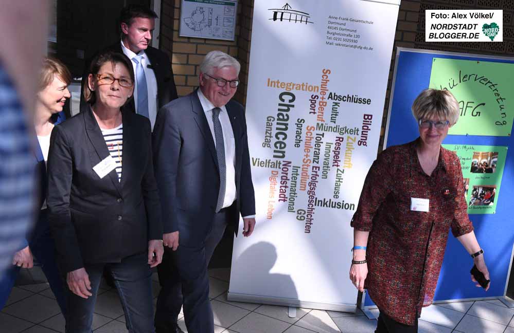 Prominenter Besuch an der Anne-Frank-Gesamtschule in der Nordstadt: Bundespräsident Frank-Walter Steinmeier informierte sich auf Einladung des Deutschen Gewerkschaftsbundes (DGB) Dortmund-Hellweg zum Abschluss und als Schirmherr der bundesweiten Themenwoche „Berufliche Bildung“ 2018 über den sog. „Ausbildungspakt“.