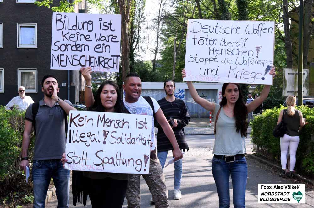 Vor der Schule kommt es zum Ende der Veranstaltung zu Protesten einer kleinen Gruppe ebenfalls junger Menschen. Sie richten sich unter anderem gegen die Rolle der Bundesrepublik im Krieg der Türkei gegen die Kurden. Steinmeier wird davon nichts mitbekommen haben. Seine Fahrzeugkolonne verlässt das Gelände auf einem anderen Weg.