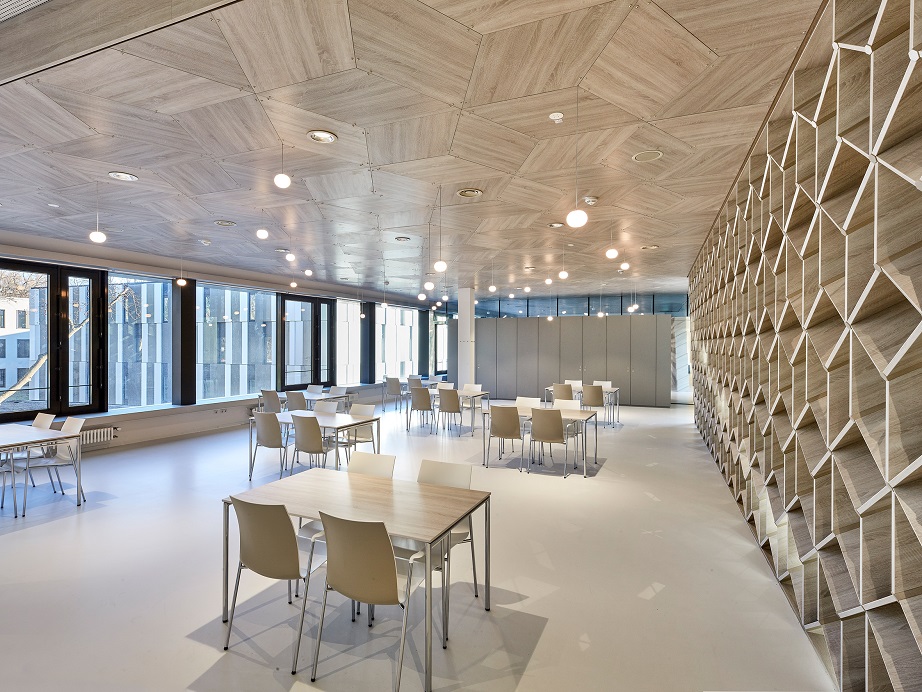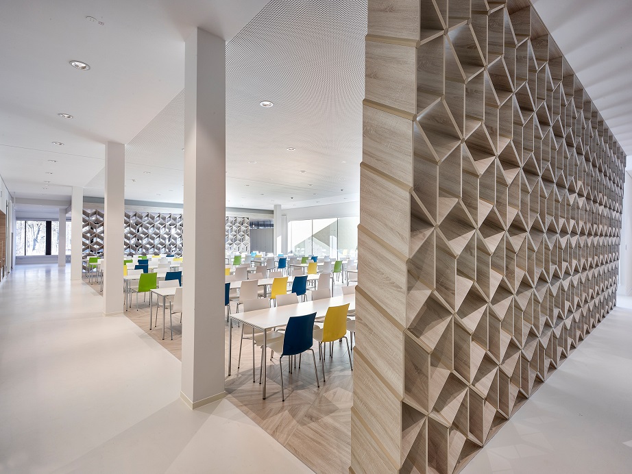 Jury: Ein eindrucksvoller Monolith. Der auch öffentlich genutzte Küchenneubau ist schlicht, aber anspruchsvoll. Geschmackvoll und im Innenraum als räumliche Holzskulptur sogar künstlerisch. Ein starkes Gebäude inmitten einer parkähnlichen Landschaft, umgeben von starken Gebäuden in der Nachbarschaft.