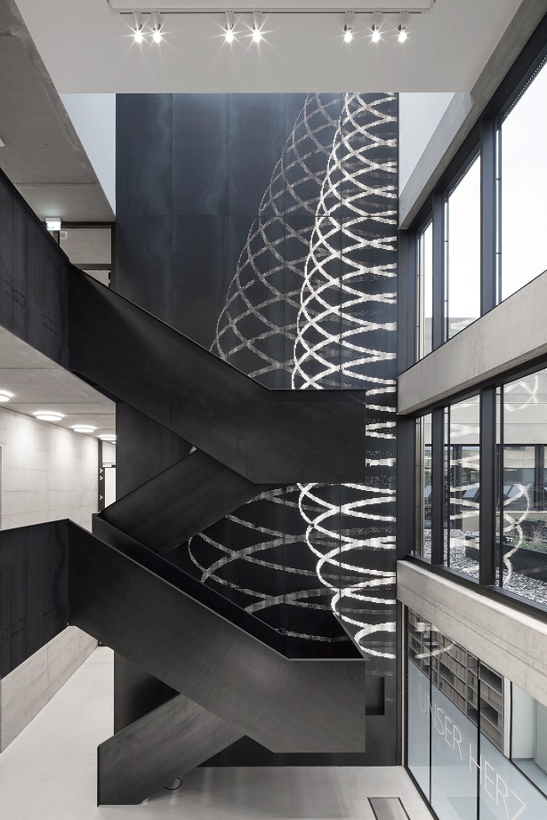 Jury: Ein Firmensitz, ein Produktionsstandort, der mit hoher Qualität, künstlerischen Ideen im Innern und Außen sowie attraktiven Arbeits- und Aufenthaltsbereichen für die Belegschaft überzeugt und dem Besucher eine klare Unternehmensphilosophie vermittelt. Mit einfachen Materialien in sehr hochwertiger Ausführung entstand ein schicker neuer Gewerbebau. Bemerkenswert die konsequente und schöne Grüngestaltung ringsum und auf der Dachterrasse.
