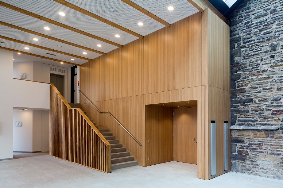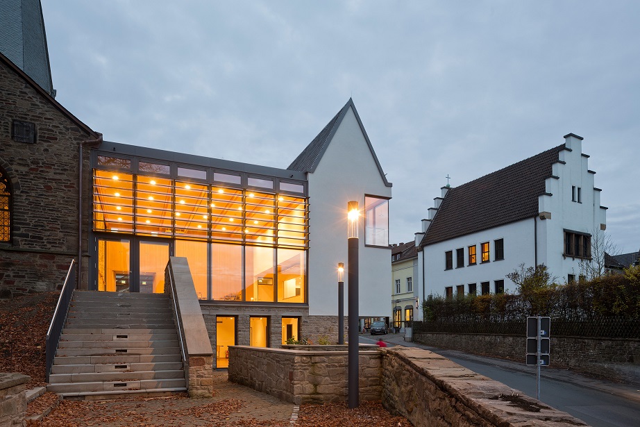 Jury: Entstanden ist ein atmosphärisch schöner Kirchhof. Das neue Gemeindehaus hat eine angenehme Größe und wirkt fast wie ein steinerner neuer Sockel für das 1000 Jahre alte Gotteshaus. So wird die Kirche auf dem Gelände neu und gut verortet. Handwerklich sehr sauber und mit schönen Materialien gebaut.