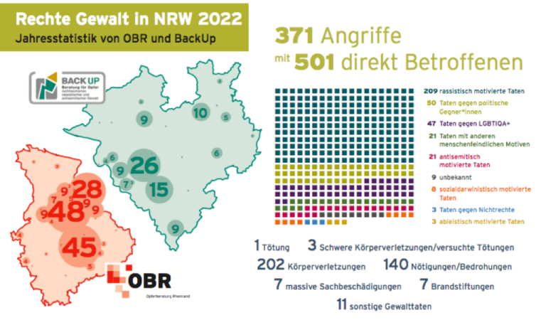 Erst kürzlich zog der Verfassungsschutz in einem Bericht Bilanz zu rechtsextremen Straftaten des vergangenen Jahres. Nun veröffentlichten auch die Opferberatungsstellen rechter, rassistischer und antisemitischer Gewalt „BackUp NRW“ und die „Opferberatungsstelle Rheinland“ ihre Zahlen zu 2022. … „BackUp NRW“ und die „Opferberatungsstelle Rheinland“ stellen die Jahresbilanz 2022 vor weiterlesen