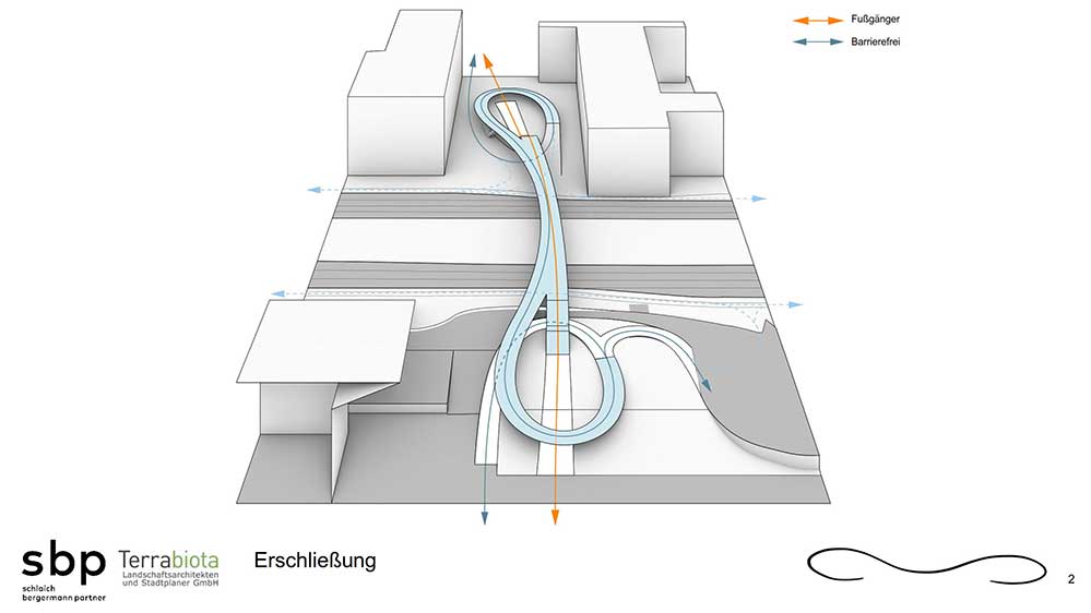 Weiterhin seien auch im Hinblick auf die Anlage der Freiflächen und das Konzept zur Beleuchtung der Brücke grundlegende Festlegungen getroffen worden. Durch die genaue Verortung von Ruhepodesten im Bereich der geschwungenen Rampen und die Optimierung der Gefällesituation seien die Anforderungen bestmöglich in den Entwurf integriert worden. Dabei hätten sowohl die erforderlichen Durchfahrtshöhen der B1 als auch die vorhandenen Anschlusshöhen an die beiden Plätze berücksichtigt werden müssen.