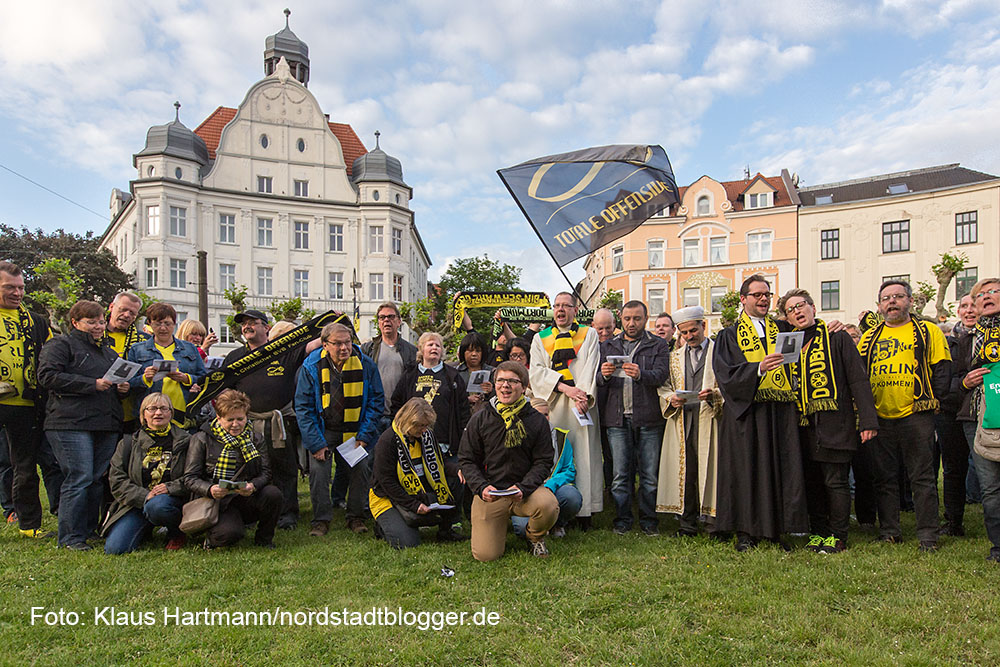 Buchvorstellung und BVB – Fans feiern vier Tage vor dem Pokalfinale unter dem Motto „Auf dem Weg nach Berlin – Wir lassen nichts unversucht“ einen ökumenischen Gottesdienst. anschließend zogen die Fans zum Borsigplatz. Immam Yilmaz, Kocatepe-Moschee, und Gemeindereferent Karsten Haug
