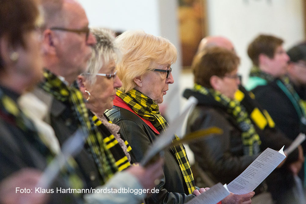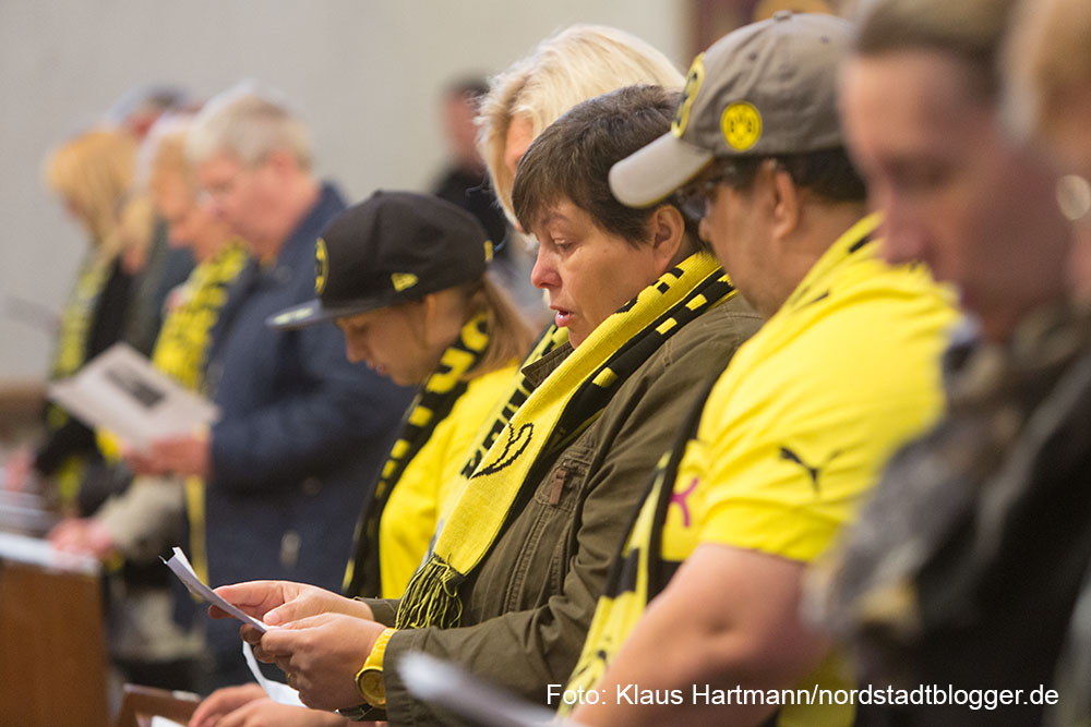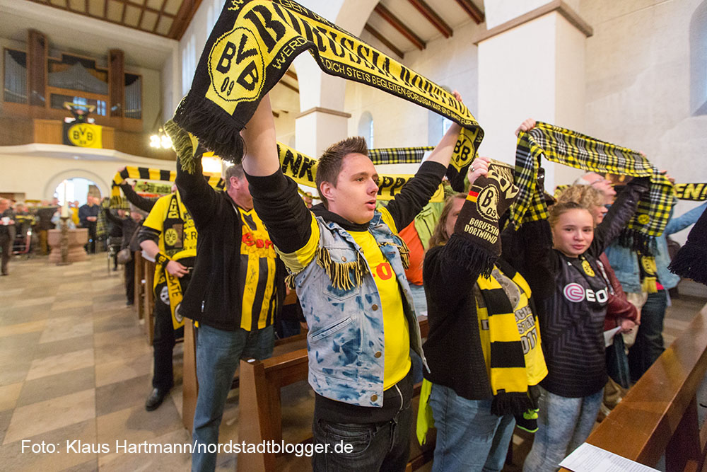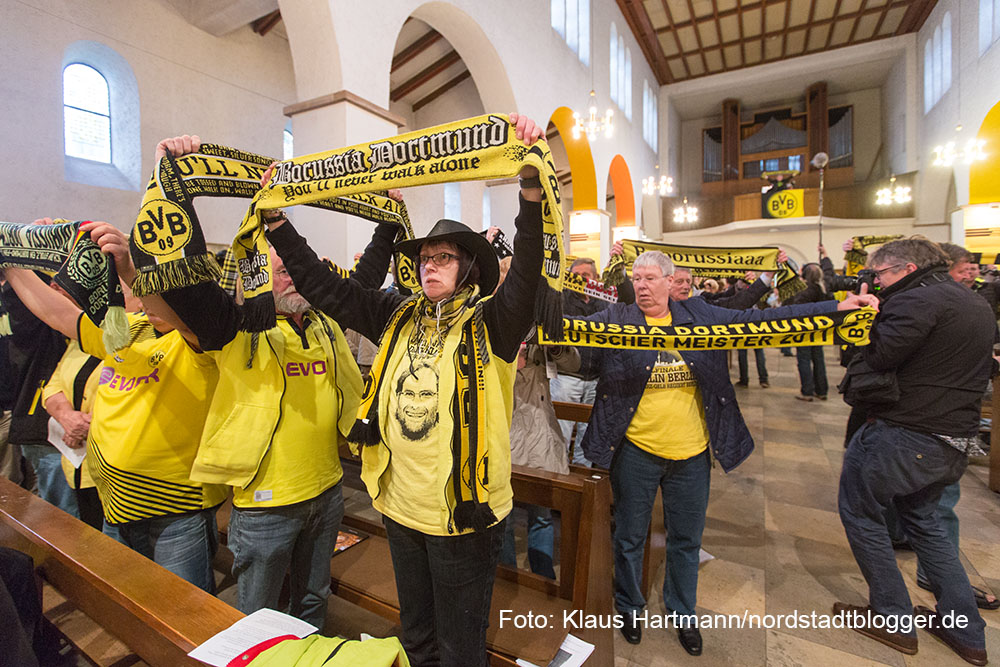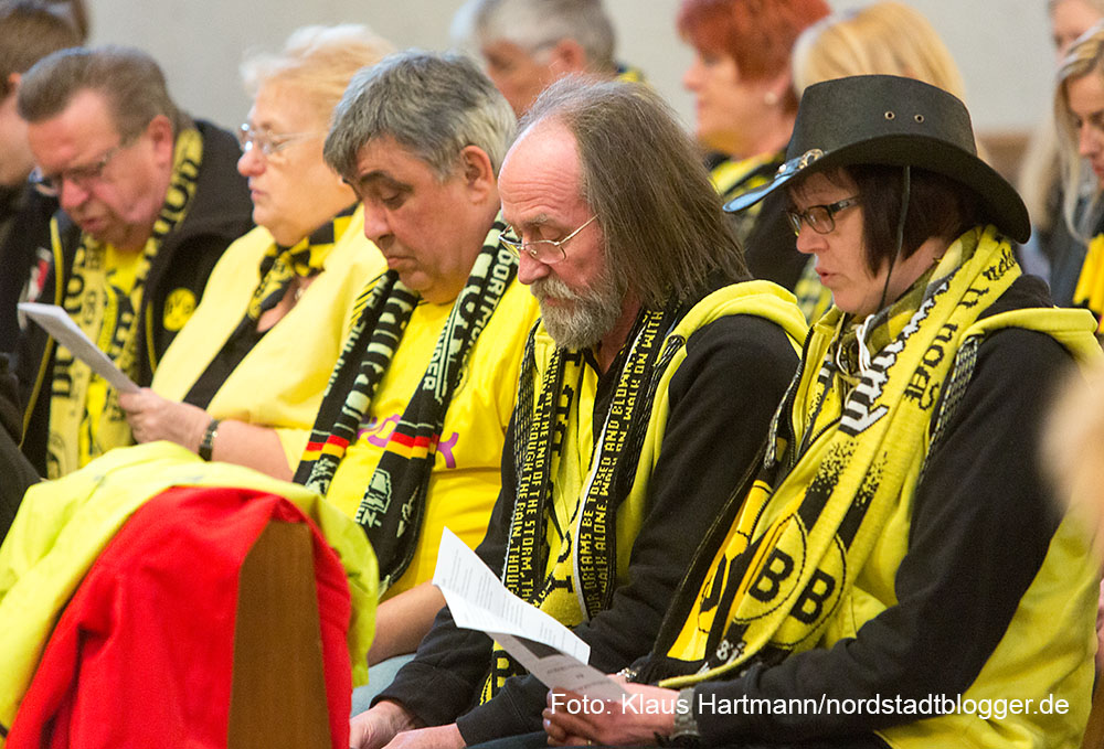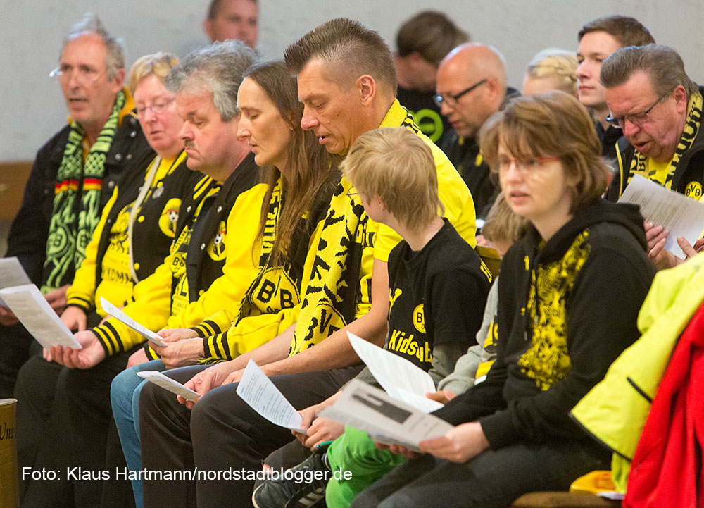 Besonders emotional wurde es, als Matthias „Katsche“ Kartner von der Empore der Kirche, „You´ll never walk alone“ anstimmte. Die versammelte Gemeinde streckte die schwarz-gelben Schals in den Kirchenhimmel und sang mit Inbrunst mit.