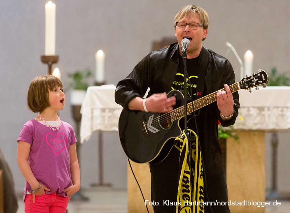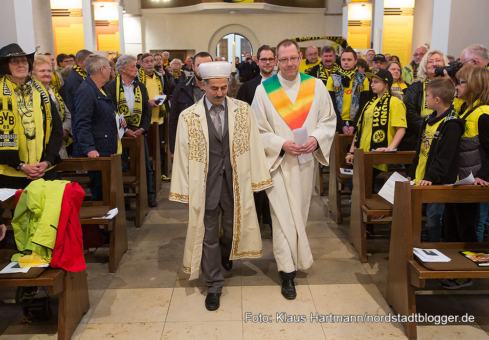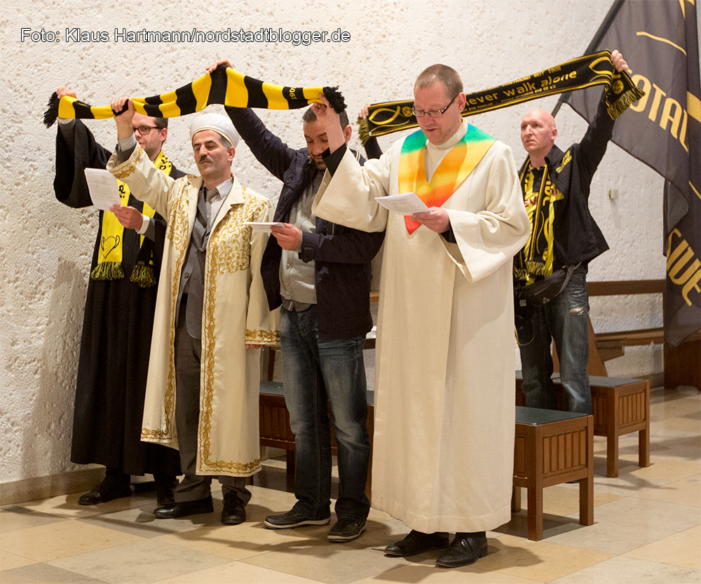 Buchvorstellung und BVB – Fans feiern vier Tage vor dem Pokalfinale unter dem Motto „Auf dem Weg nach Berlin – Wir lassen nichts unversucht“ einen ökumenischen Gottesdienst. anschließend zogen die Fans zum Borsigplatz. Immam Yilmaz und Gemeindereferent Karsten Haug