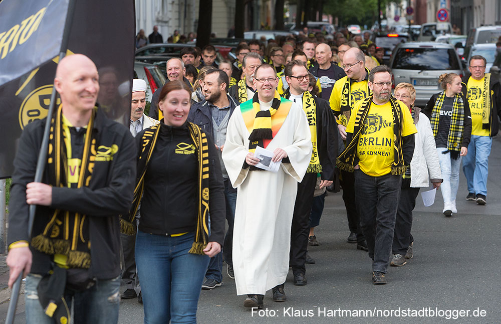Buchvorstellung und BVB – Fans feiern vier Tage vor dem Pokalfinale unter dem Motto „Auf dem Weg nach Berlin – Wir lassen nichts unversucht“ einen ökumenischen Gottesdienst. anschließend zogen die Fans zum Borsigplatz