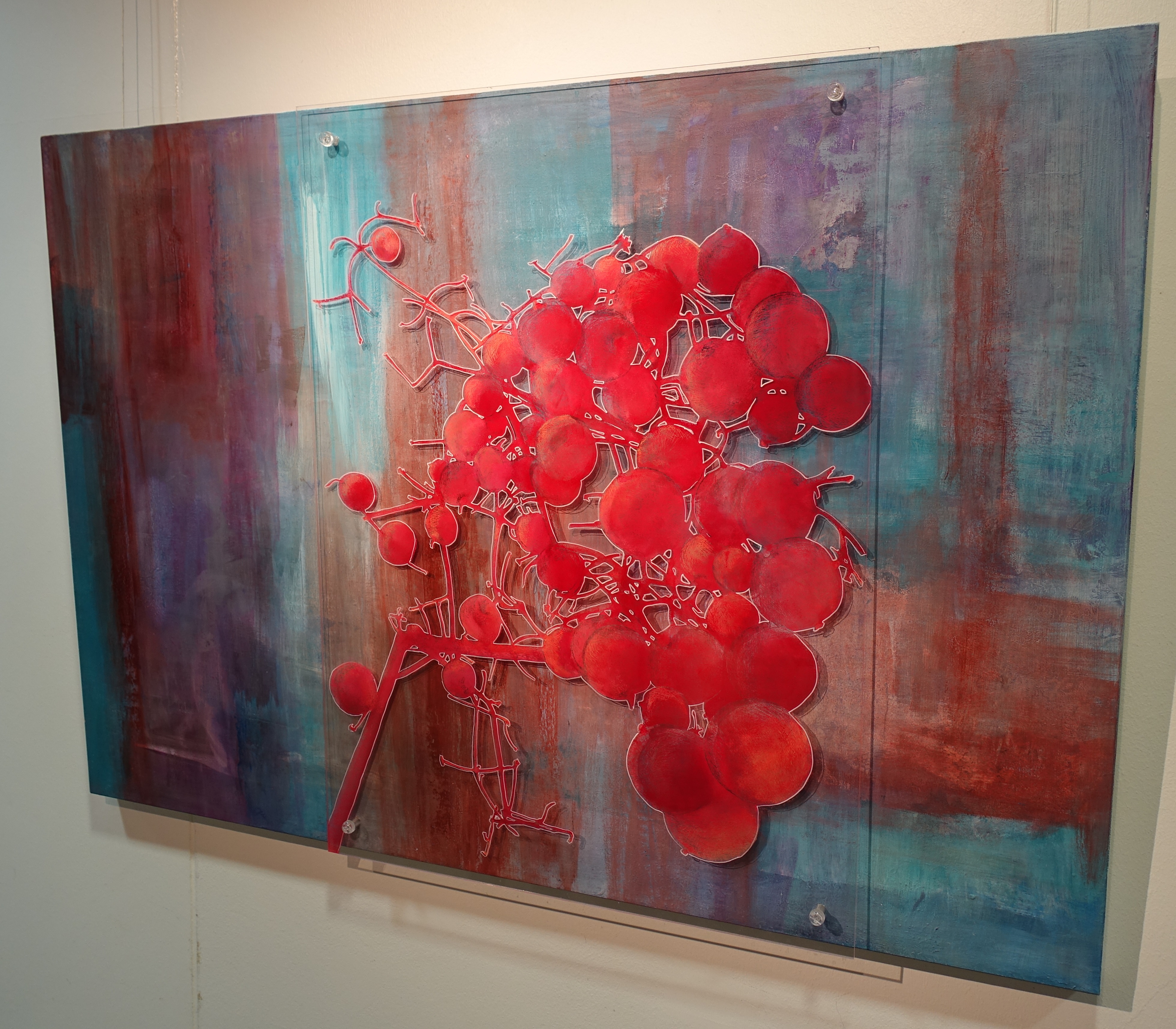 „Bevor ich dem Glaser erklärt habe, wo die Bohrungen sein sollen, oder welchen Abstand ich haben möchte, bin ich bei Verwendung von Acryl schon fertig, obgleich ich mir immer sehr viel Zeit nehme“, so Brigit Brinkmann-Grempel. Es ist gerade dieser Effekt der Zweidimensinalität, der die Perspektive im Bild verändert. „Treten Sie als Betrachter einen Schritt zur Seite und sie entdecken verdeckte Strukturen. So erhält das Bild, durch das der Blick gleitet, seinen besonderen Reiz.“
