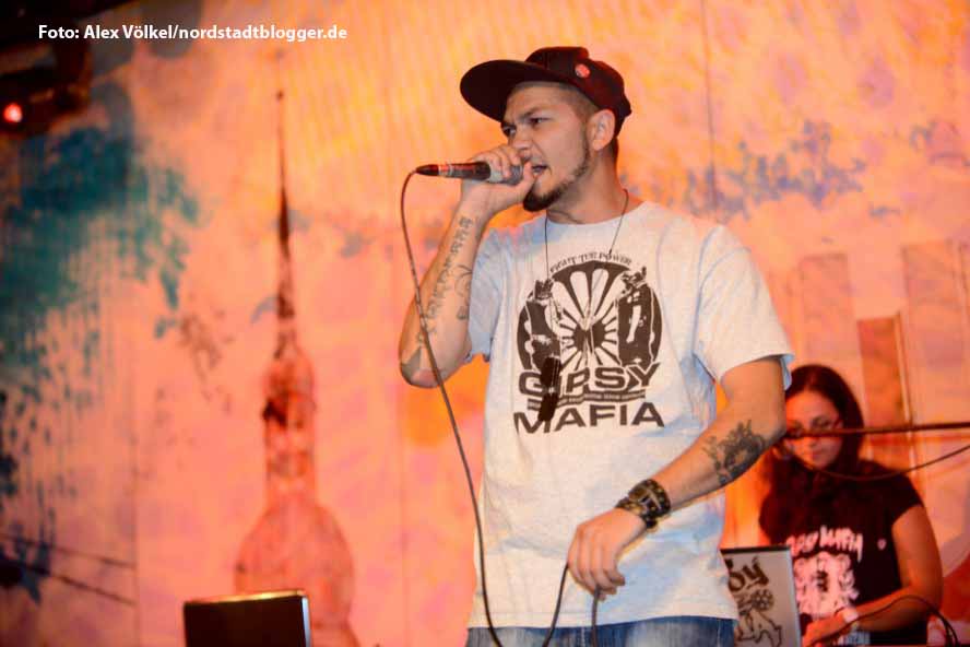 Insbesondere die serbischen Musiker der Gipsy Mafia setzten hier deutliche antifaschistische und antikapitalsitische Akzente und brauchen den begeisterten Zuhörerinnen und Zuhörer auch einige Worte aus der Roma-Sprache Romanes bei.