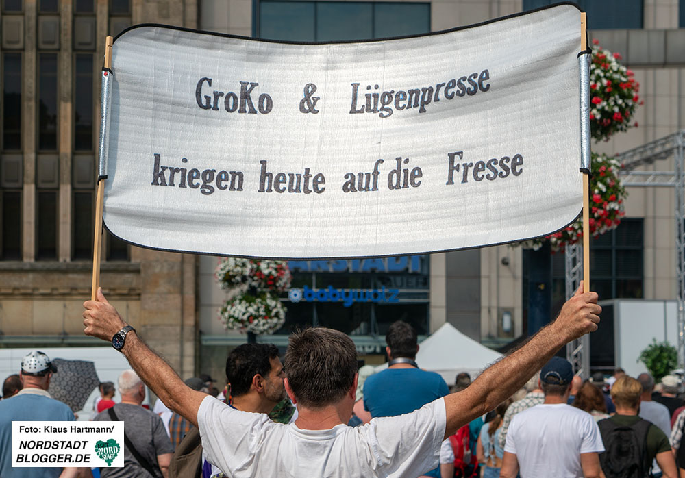 Doch nicht nur zu den Infektionsschutzmaßnahmen hatten die selbsternannten „Corona-Rebellen“ ein schwieriges Verhältnis. Journalist*innen waren auf der Kundgebung immer wieder Beleidigungen und Anfeindungen ausgesetzt. Man selbst wollte zwar nicht fotografiert werden, im Gegenzug wurden aber immer wieder Aufnahmen der Pressevertreter*innen angefertigt und Schilder mit Parolen wie „GroKo und Lügenpresse kriegen heute auf die Fresse“ hochgehalten.