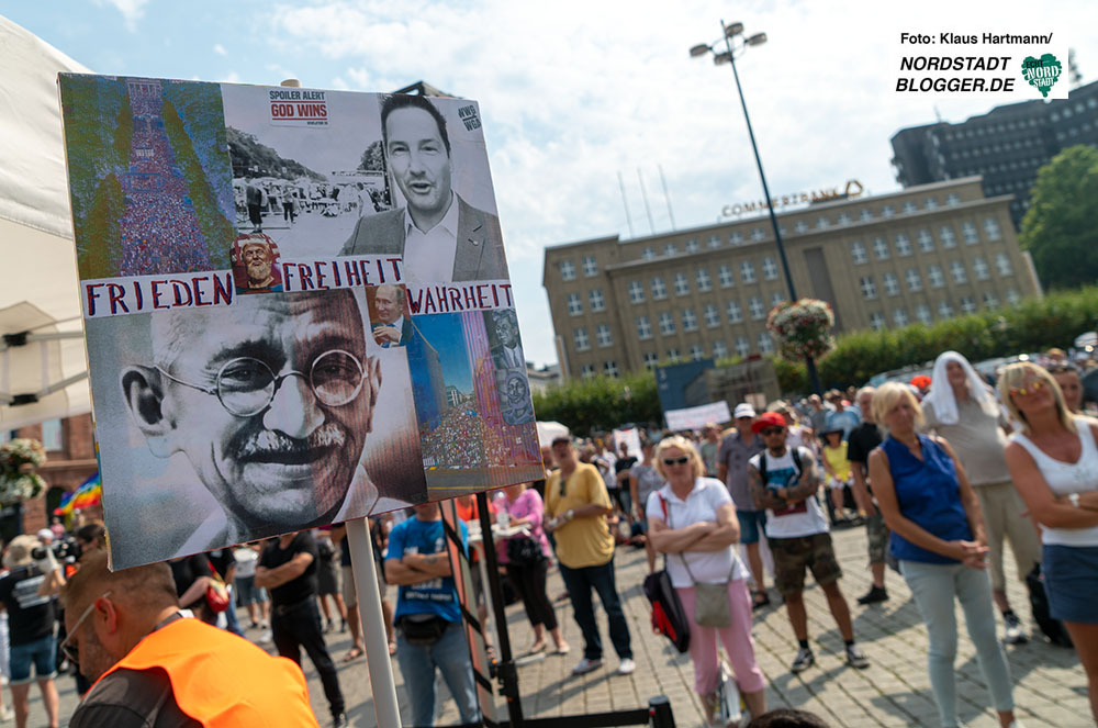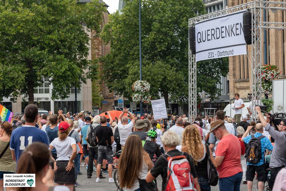 Nach der Demonstration in Berlin am 1. August stand an diesem Wochenende Dortmund im Fokus der Verschwörungsgläubigen und Coronaleugner*innen. In der Spitze hatten sich 2.800 Menschen in der Innenstadt versammelt, um ein „Festival für Frieden und Freiheit“ abzuhalten. Tatsächlich ging es aber hauptsächlich darum Verschwörungsideologien zu verbreiten und gegen Presse und Politik zu hetzen.