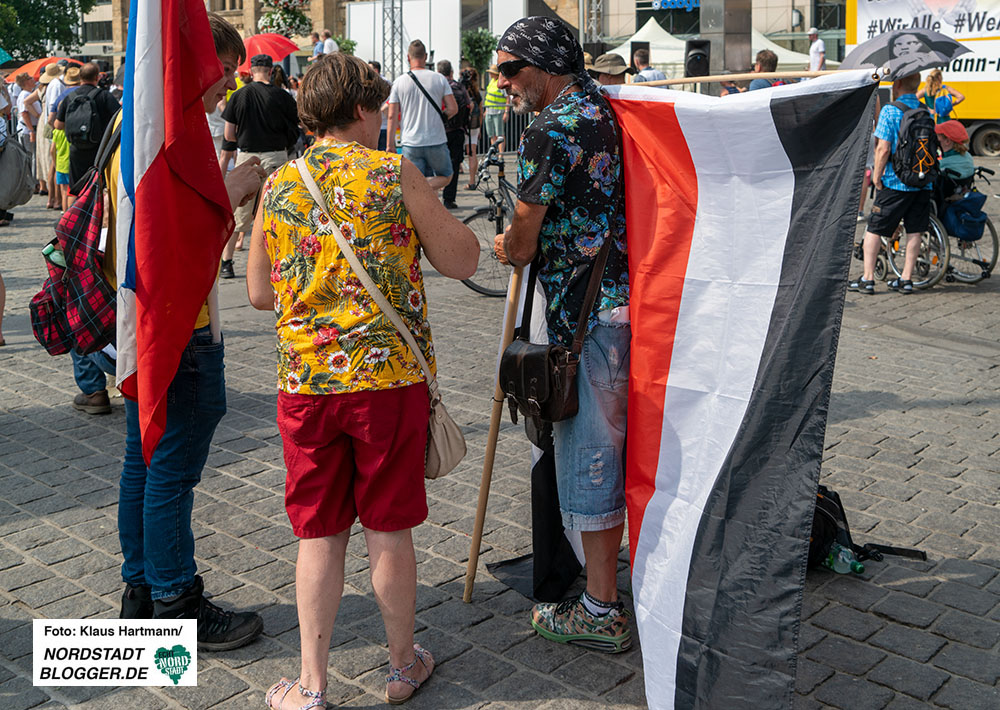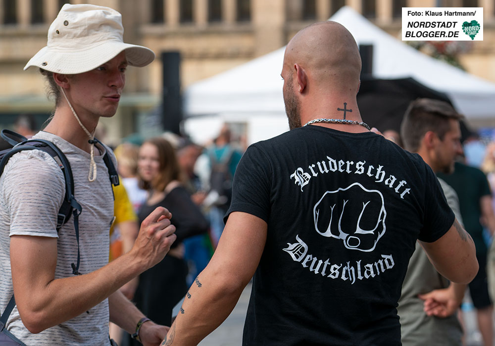 Eine Abgrenzung der Organisator*innen von Rechtsextremen und Neonazis befand sich zwar auf dem Veranstaltungsflyer, die Praxis sah allerdings anders aus. Dazu passen auch die unterschwelligen und teils unverhohlenen Drohungen. So betonte einer der Redner: „Wer eine friedliche Revolution verhindert, macht eine gewaltsame unausweichlich.“