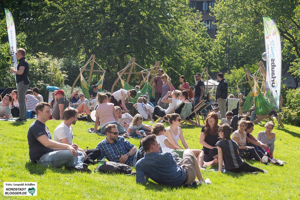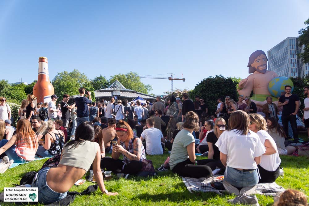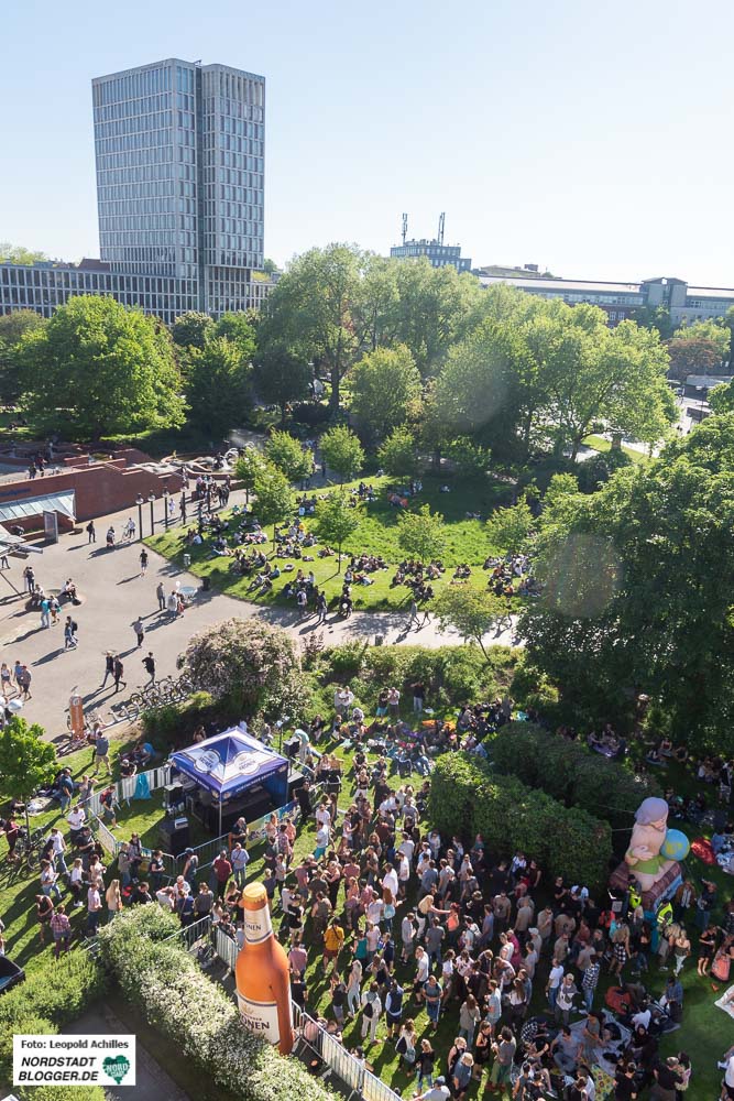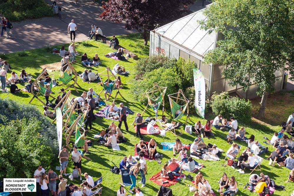Ein paar Meter weiter, auf den Wiesen an der Westseite des Rathauses, ging es ab 15 Uhr dann langsam mit elektronischer Musik los. Denn der Samstag war der Musiktag des Cityfestes. Noch etwas verhalten ließen sich die ersten Gäste in den Dortmunder-Kronen Liegestühlen und den Urlaubsguru-Hängematten nieder, um bei gechillten Sounds in der Sonne zu entspannen. Im Laufe des Nachmittags füllte sich der Stadtgarten immer mehr bis er schließlich gegen 20 Uhr neben der Bühne am Friedensplatz der absolute Party -Hotspot war.
