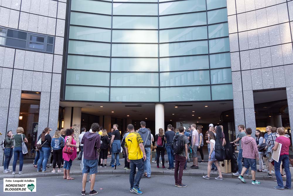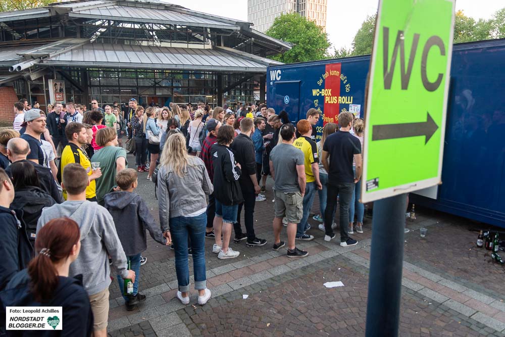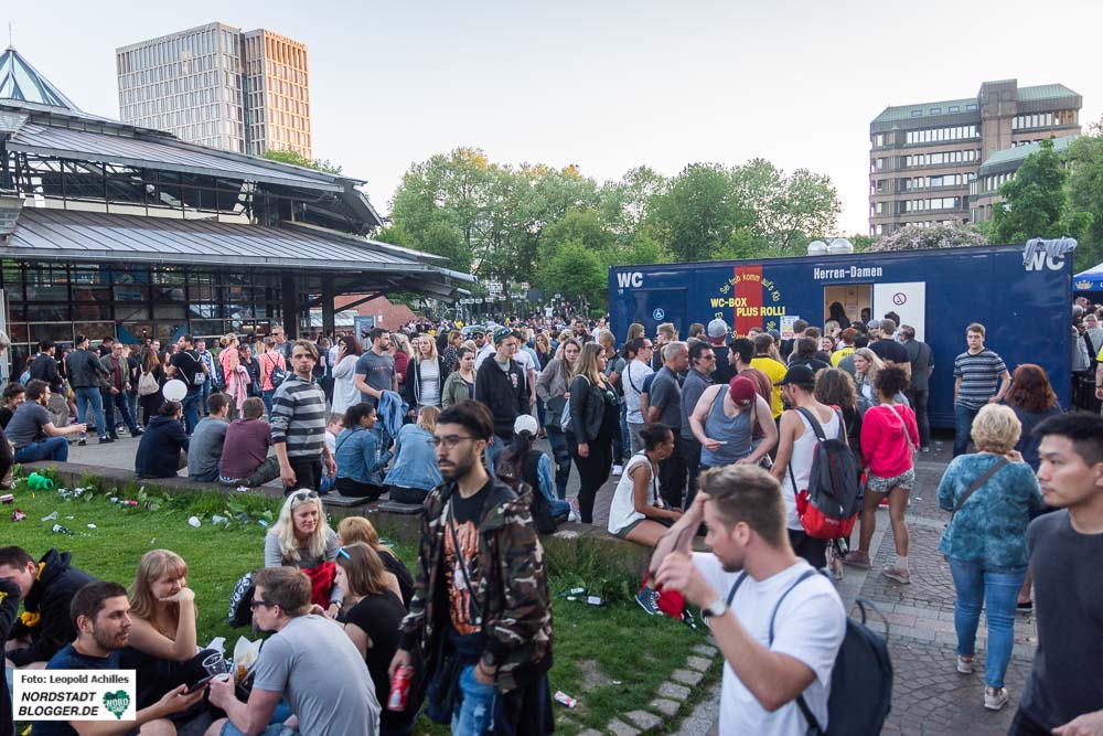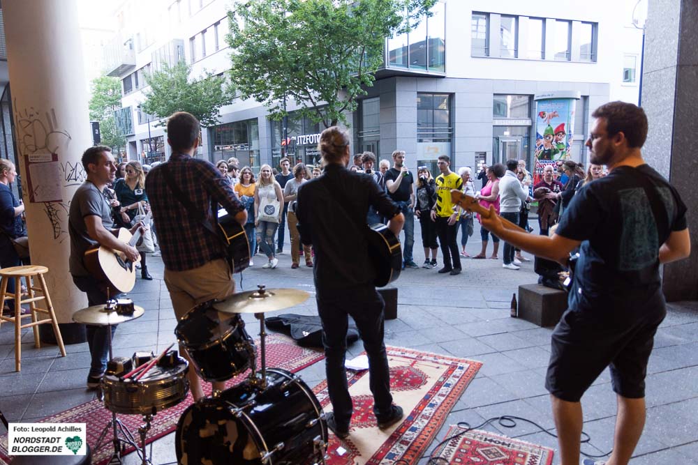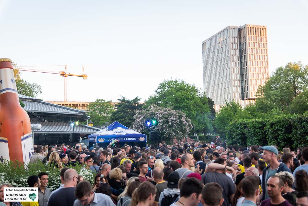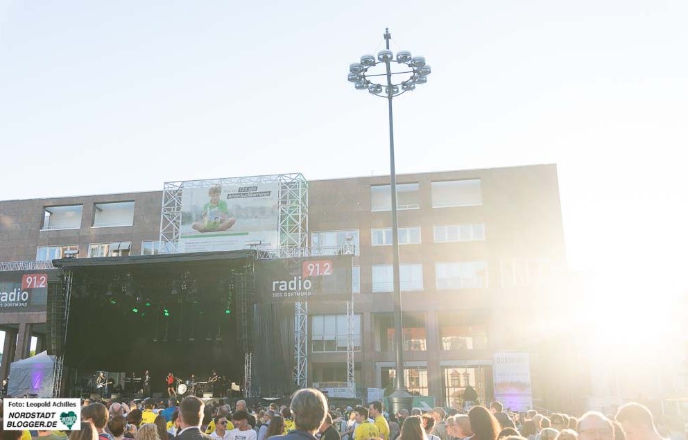 Am späten Nachmittag dann füllte sich langsam aber sicher der Friedensplatz mit den ersten BesucherInnen. Hier erwartete das Publikum von 18 Uhr bis Mitternacht ein buntes Musikprogramm, zusammengestellt von Radio 91.2. Im Laufe des Abends strömten Menschen aus allen Richtungen auf den Platz zu und von Süden her mischten sich die BVB-Fans, trotz Niederlage in bester Laune, unter das Partyvolk und machten die Menge noch ein Stückchen bunter.