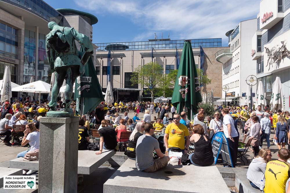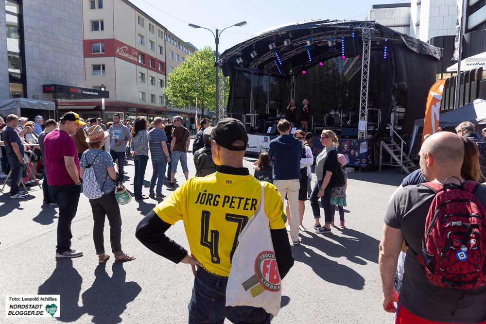 Am Alten Markt drehte sich alles um das Thema BVB. Maskottchen Emma präsentierte hier unter anderem den Kinderchor des Helmholtz-Gymnasiums, bevor am Abend Jo Marie Dominiak aus Dortmund mit ihrer Mischung aus Country, Pop und Rock für den musikalischen Abschluss sorgte.